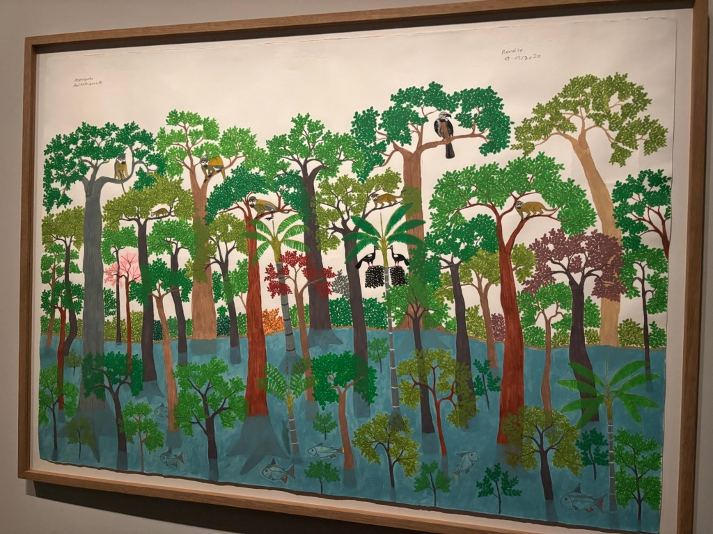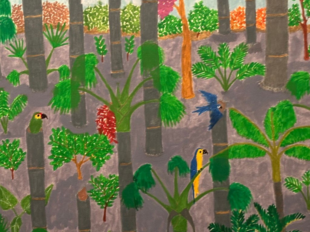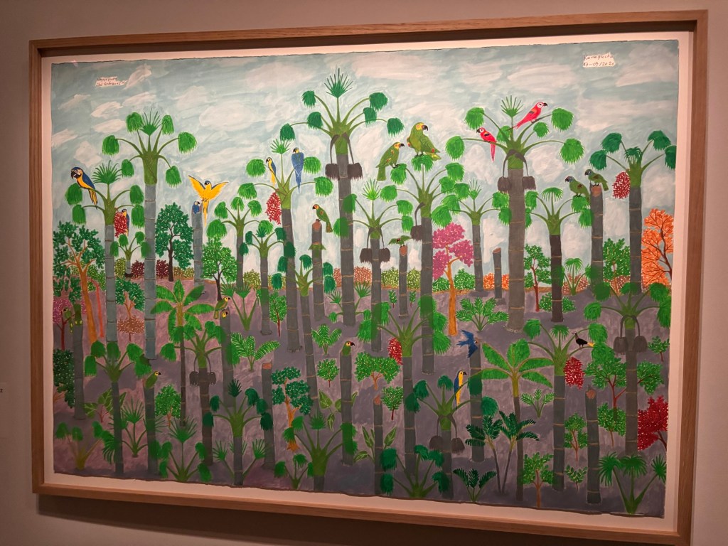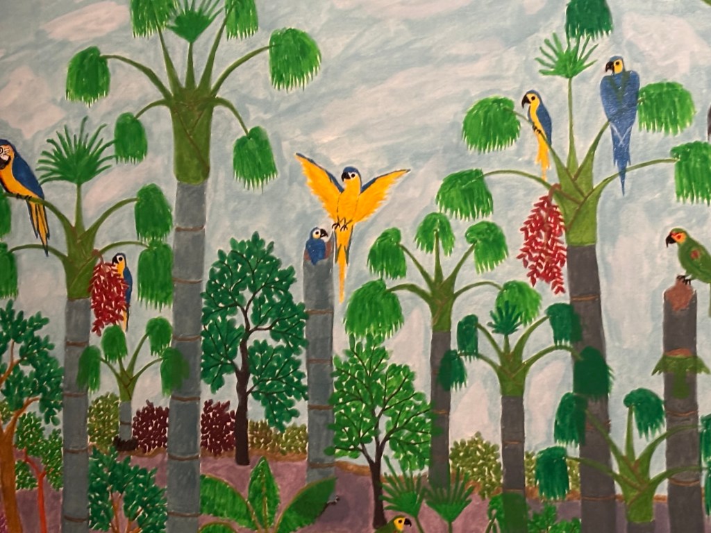 Je me suis aussi régalée à me prélasser dans les peintures des arbres et forets gigantesques. Arbres qui s’étirent vers le ciel – ce dernier étant « Sky is the limit » ! Et les couleurs vertes de tout ton et le marron des troncs qui s’élancent donne la démesure dans laquelle les Indiens vivent. Et surtout les oiseaux qui volent d’arbre en arbre ou bien se posent en haut des branches pour admirer la canopée et survivre à ce monde immense. Cela m’a fait penser au Costa Rica avec ses perroquets, Ara et tant d’autres oiseaux.