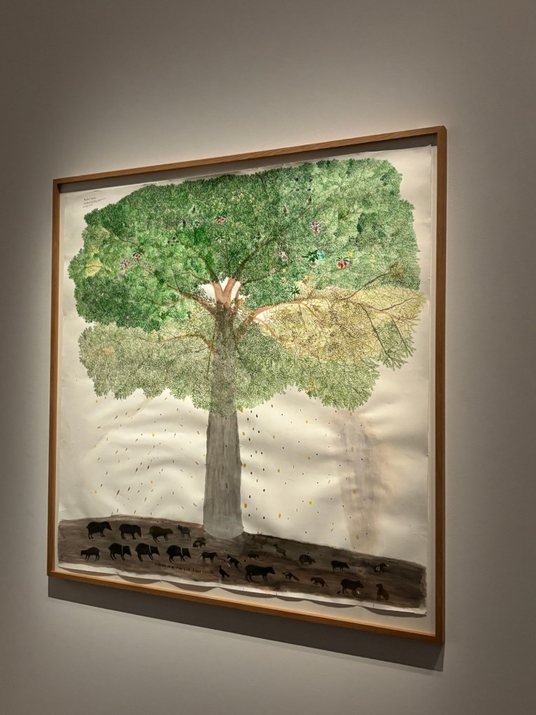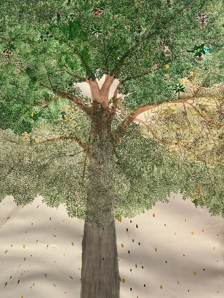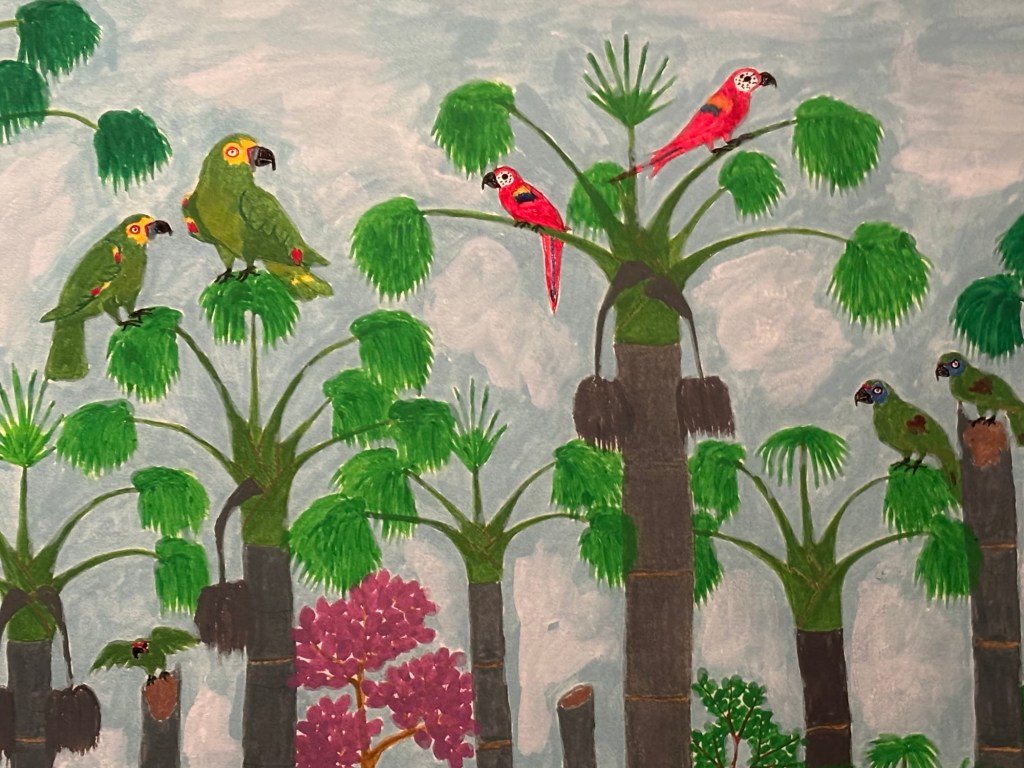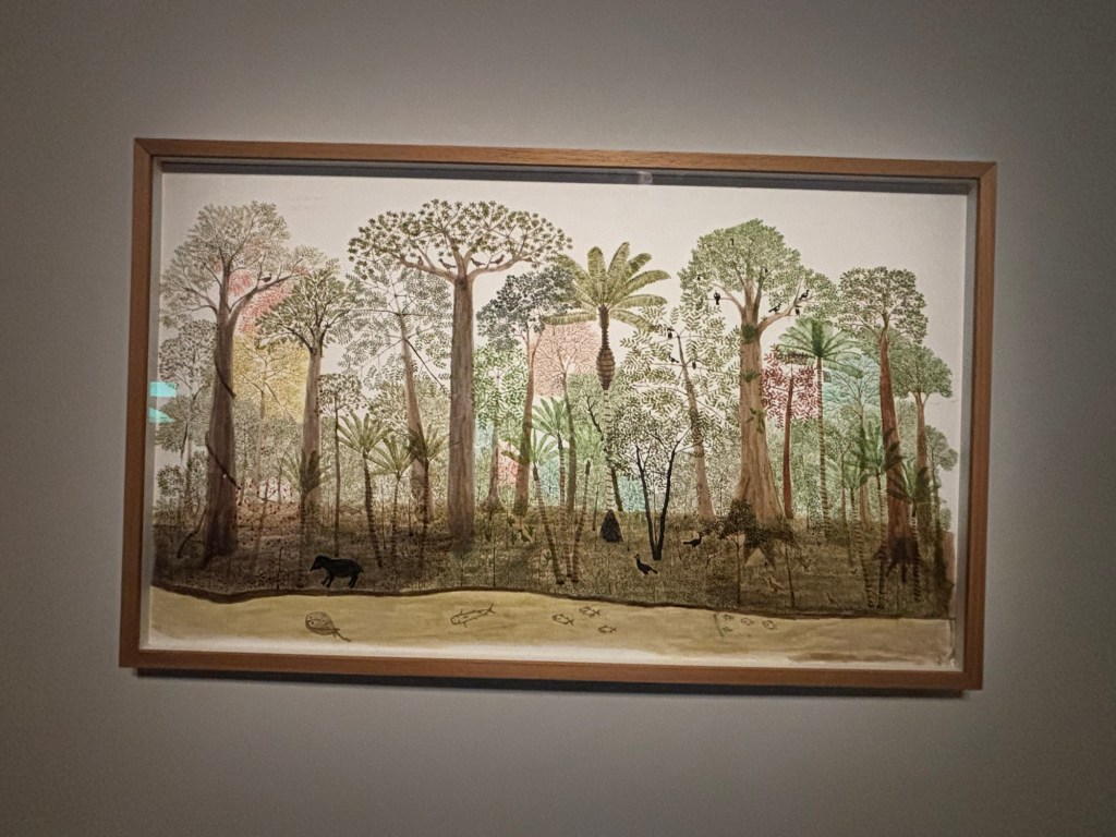 Je me suis aussi régalée à me prélasser dans les peintures des arbres et forets gigantesques. Arbres qui s’étirent vers le ciel – ce dernier étant « Sky is the limit » ! Et les couleurs vertes de tout ton et le marron des troncs qui s’élancent donne la démesure dans laquelle les Indiens vivent. Et surtout les oiseaux qui volent d’arbre en arbre ou bien se posent en haut des branches pour admirer la canopée et survivre à ce monde immense. Cela m’a fait penser au Costa Rica avec ses perroquets, Ara et tant d’autres oiseaux.