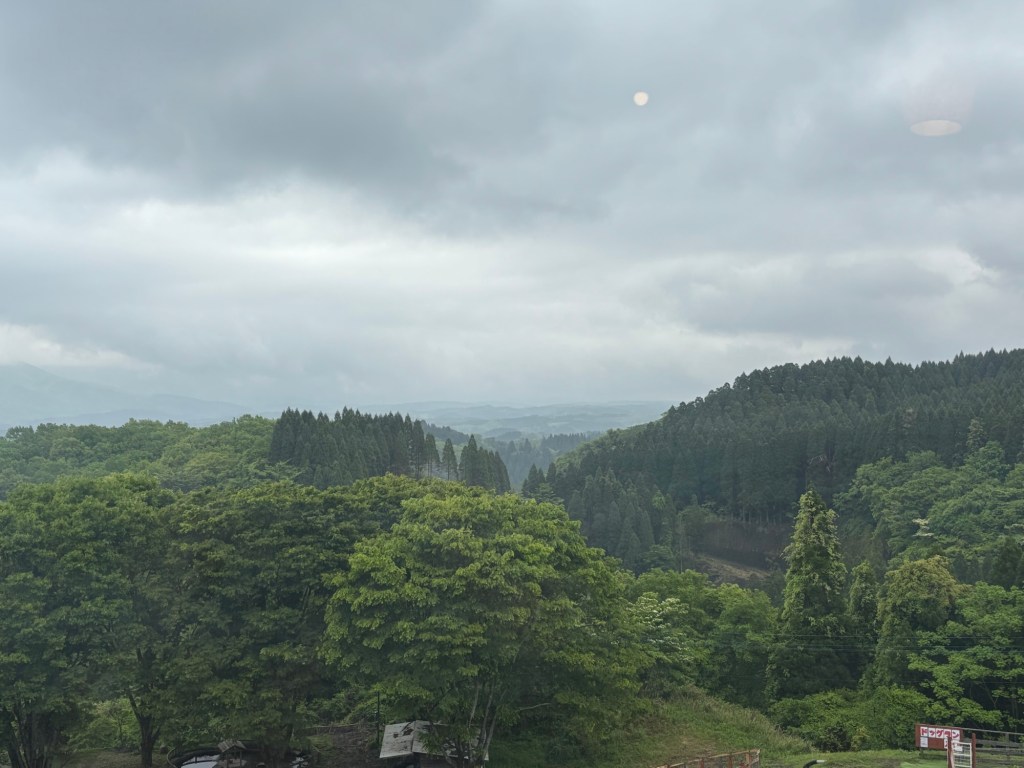 Me dirigeant de Yufin au mont Aso j’ai suivi une route de montagnes, de virages, de forêts de sapins et surtout accompagnée d’un ciel gris et menaçant. Cela donnait même des vues dignes des ombres japonaises !