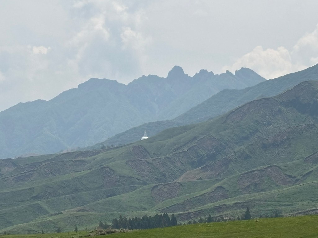 Un ciel bleu agrémentait ma route et la verdure des champs environnants. A chaque fois je suis étonnée par ces champs en forme de soucoupe. Champs où paissent des vaches et où galopent des chevaux. D’ailleurs à un coin de montagne se cachait un stupa blanc au milieu de nulle part.