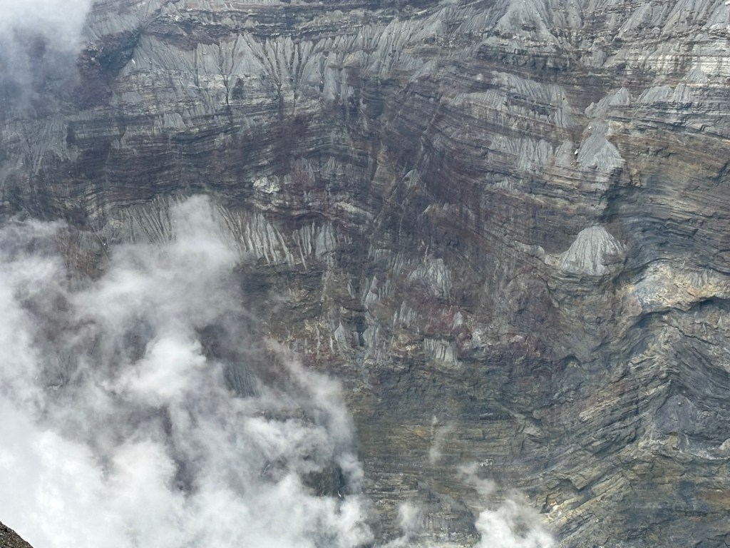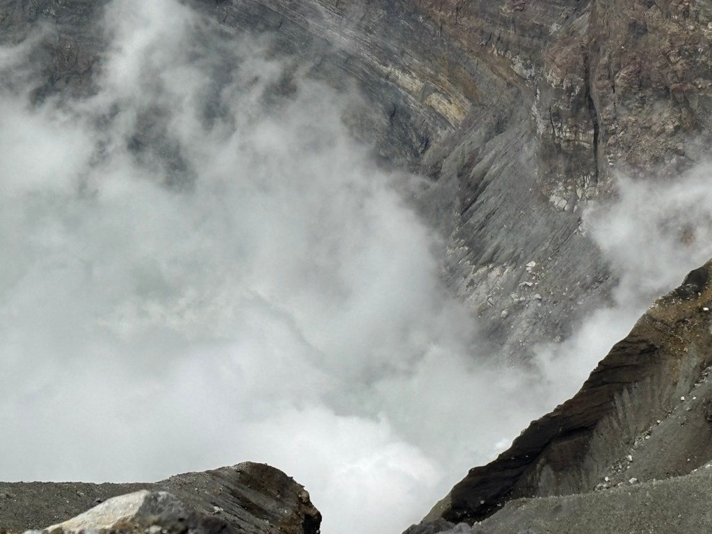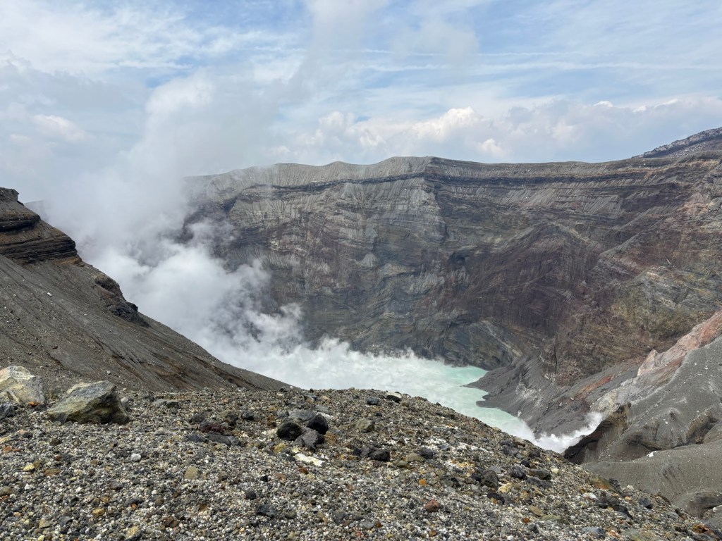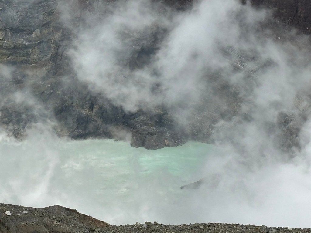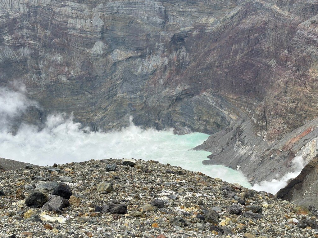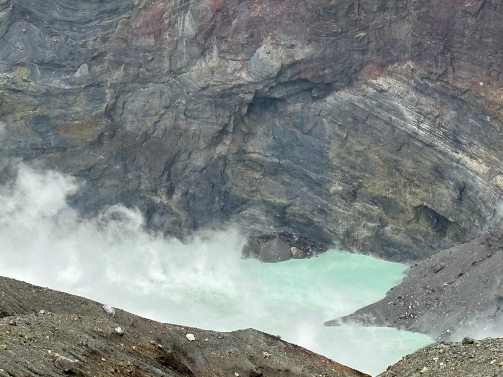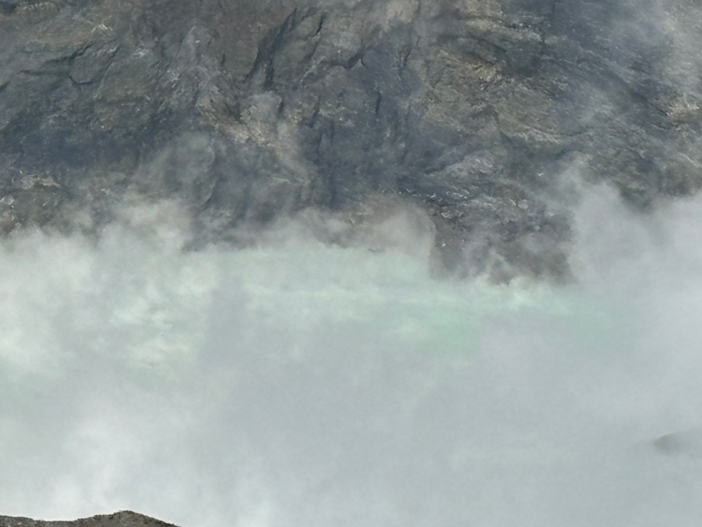 Et là tout à coup s’offre le cratère, tout de lait vert turquoise. Des fumerolles s’échappent et parfois recouvrent l’entièreté du cratère vous empêchant de le voir en entier.