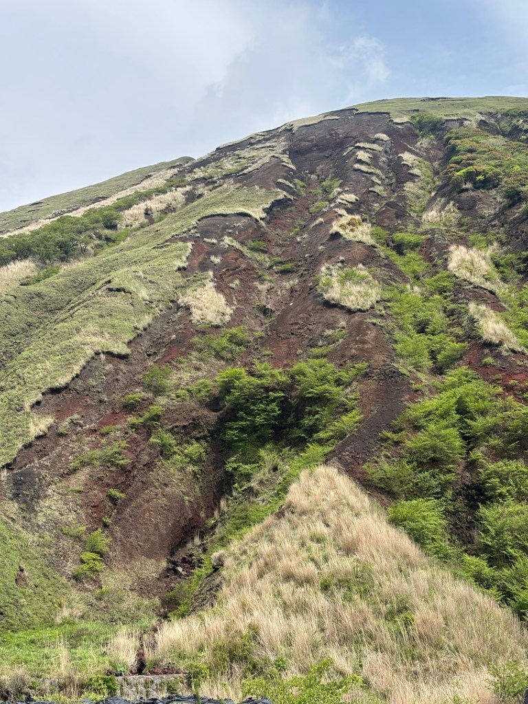 J’ai adoré regarder ce mont vert avec une sorte de fermeture éclair sur son flanc et surtout le contraste entre le vert qui le recouvre et les herbes sèches couleur paille des champs environnants. A son pied un lac et tout autour une terre comme labourée, retournée en tout sens avec des coulées pour la lave. Les nuages étaient aussi impressionnants comme des soucoupes volantes blanches plus ou difformes.