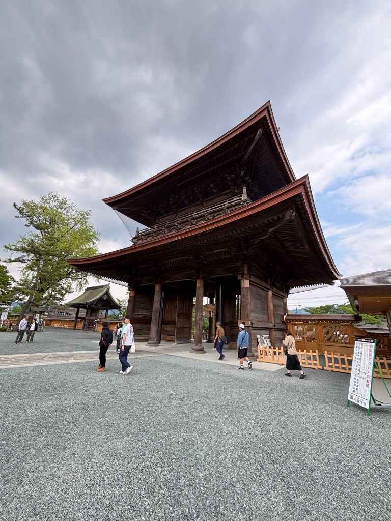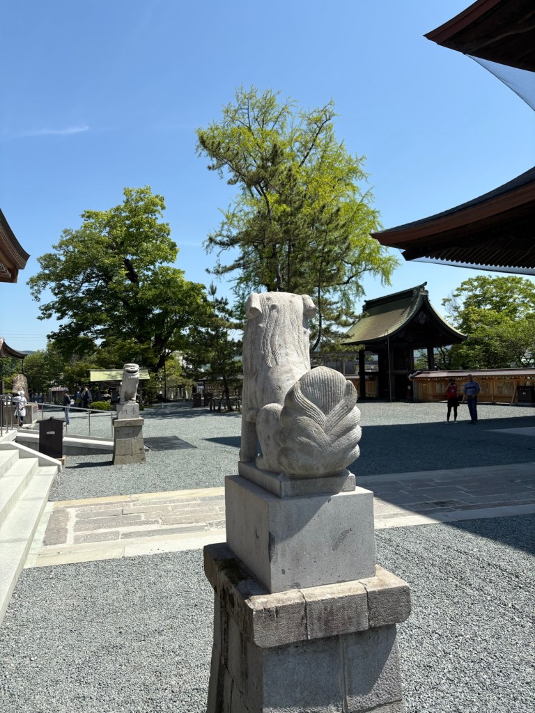 Passée cette porte avec son portique en paille de riz blond, on pénètre dans un monde zen où tout est gris. Face à soi se trouve le temple où s’effectuent les rituels. Les deux lions vous protègent, puis on monte les quelques marches, on jette des pièces dans l’espace fait pour, on s’incline plusieurs fois et on claque des mains.