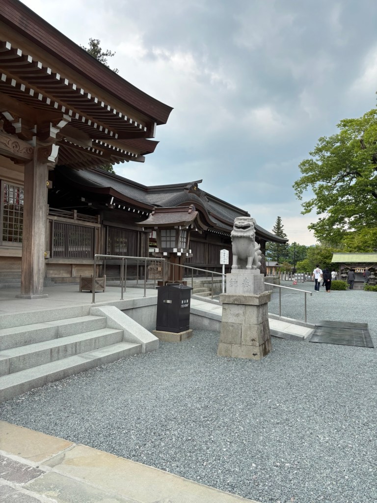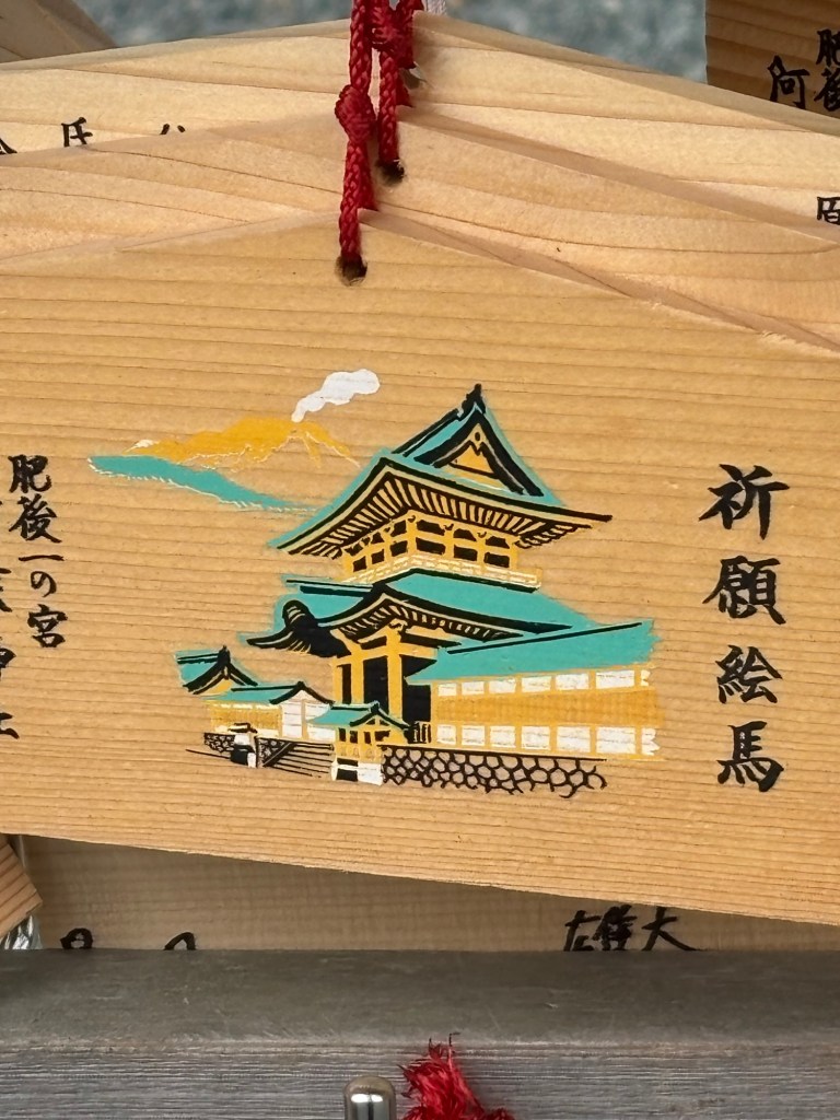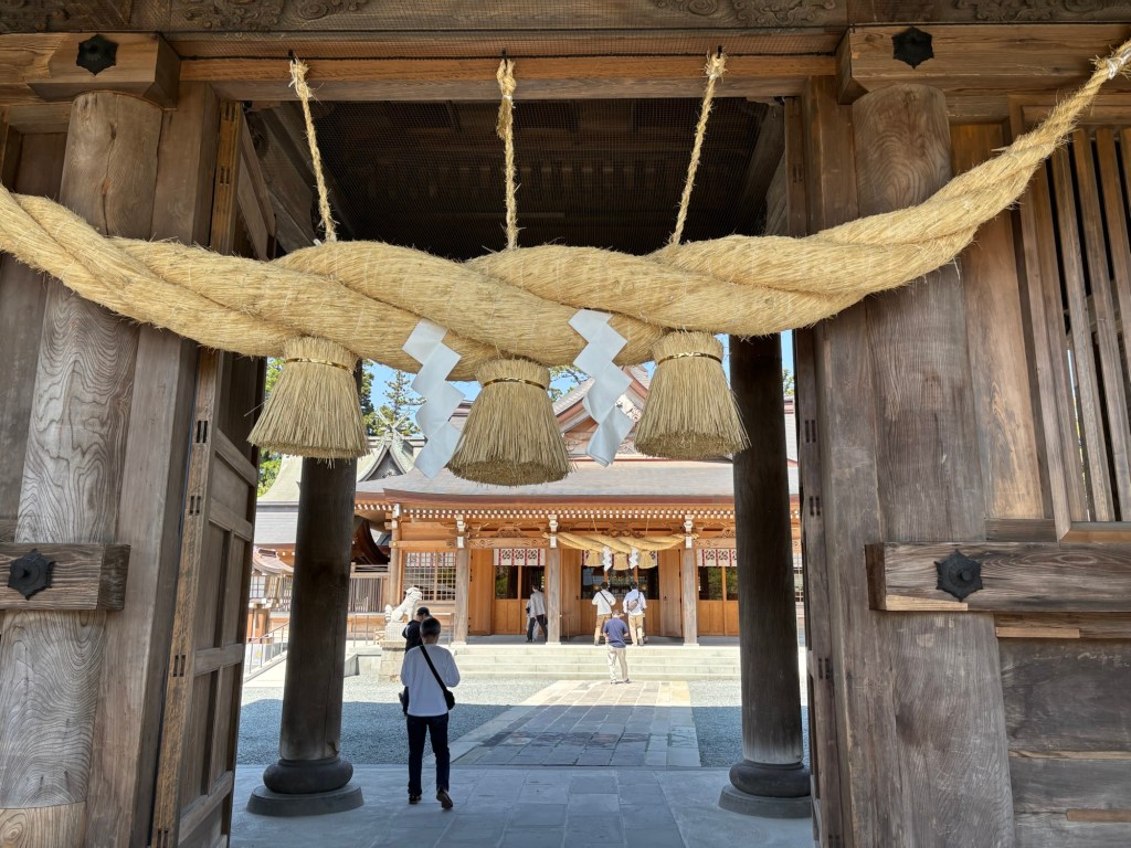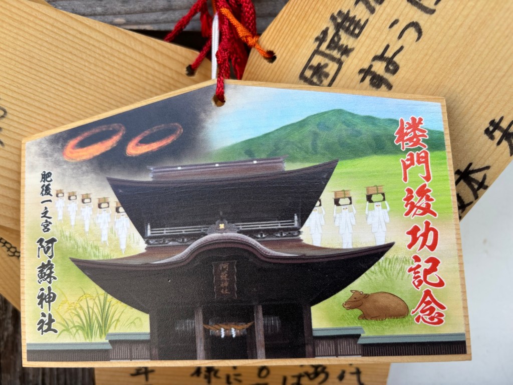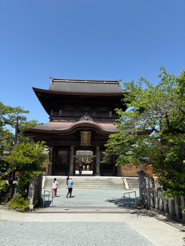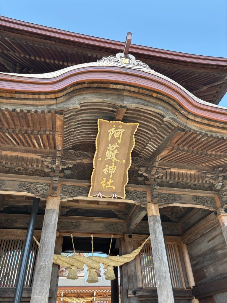 De là je me suis rendue en voiture au temple Aso, véritable découverte. Tout de bois ce temple a été construit par Takeiwatasunomikoto, enterré ici. Une cérémonie avait été faite et se nomme le rituel Aso de la ferme et fait partie de la culture Aso. Rituel toujours pratiqué par les gens de la vallée d’Aso.