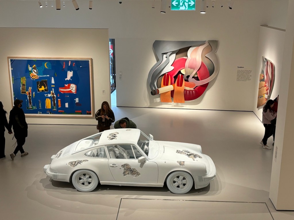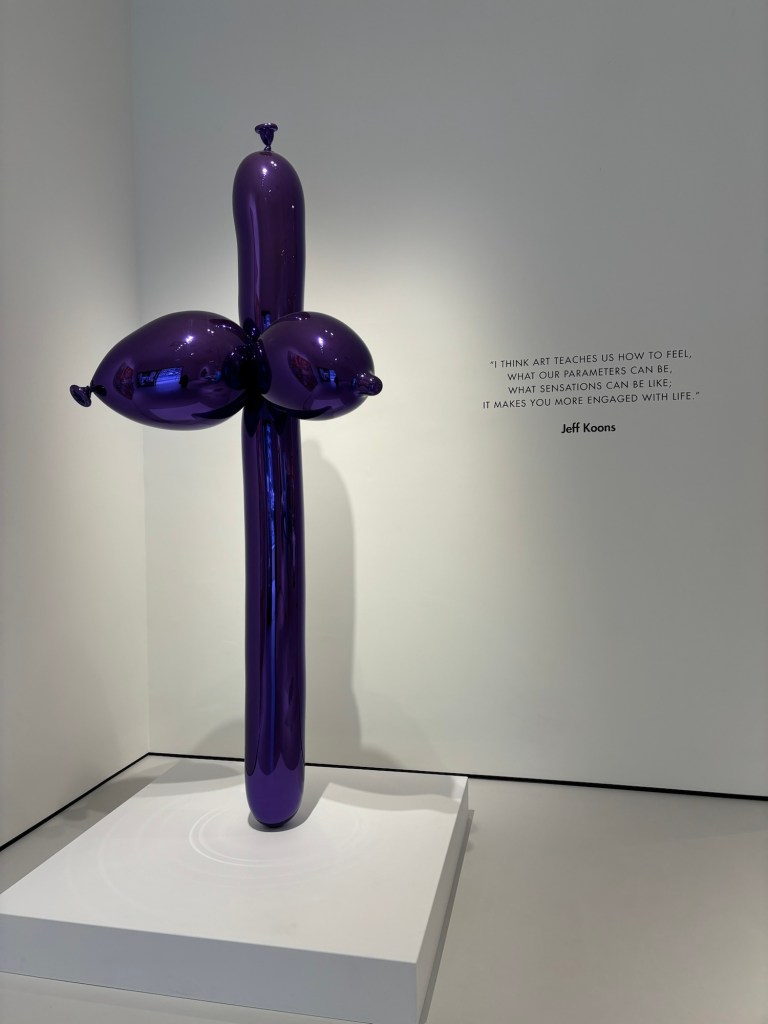On entre dans le musée par des grandes baies vitrées qui donnent espace et luminosité et que voit-on une œuvre de Jeff Koons réalisée en ballon gonflable violet foncé : un homme ou une femme aux seins proéminents vous attend. Comme le dit si bien Jeff Koons « cela vous engage plus dans le vie ».