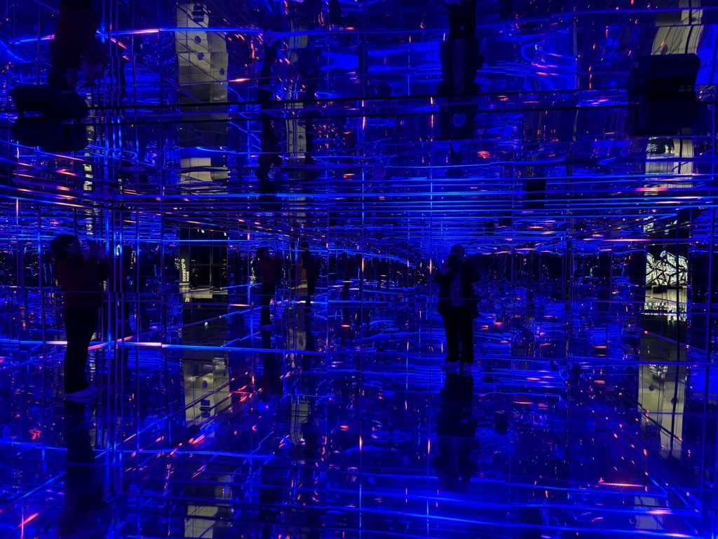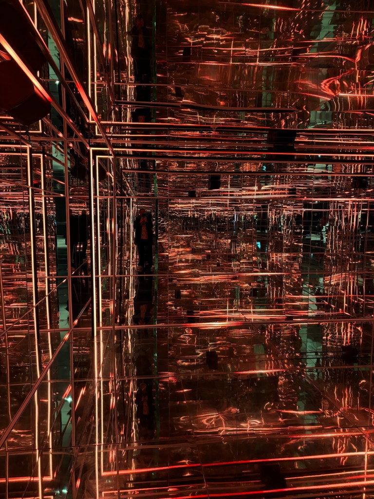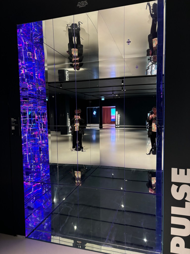 Et au sous-sol j’ai cru entrer dans une autre dimension, autre monde comme au musée Grévin où les formes existantes dans les glaces qui nous font face se transforment et nous projettent dans une autre réalité. Le thème en est Pulse et les couleurs se superposent du bleu foncé au vert, rouge et orange et change le prisme de la vie. Des mondes colorés se superposent, nous happent et nous absorbent. Impressionnant cette variété de couleurs très prononcées et grises à la fin. Comme si le monde qui nous entoure faisait place à un gris déplacé que l’on refuse.