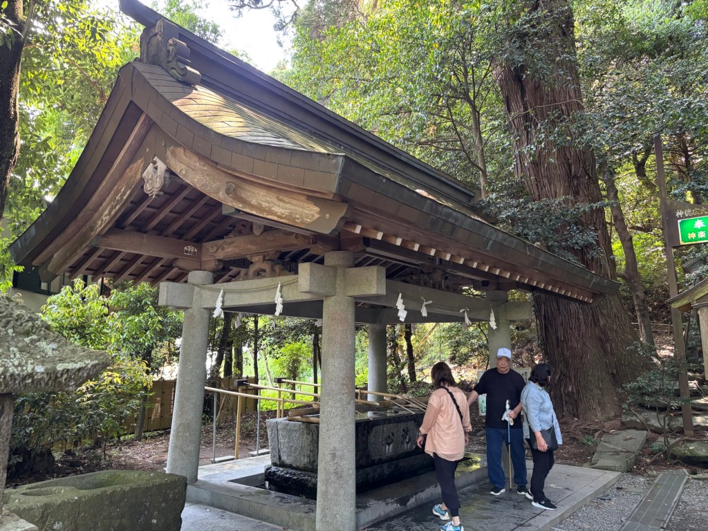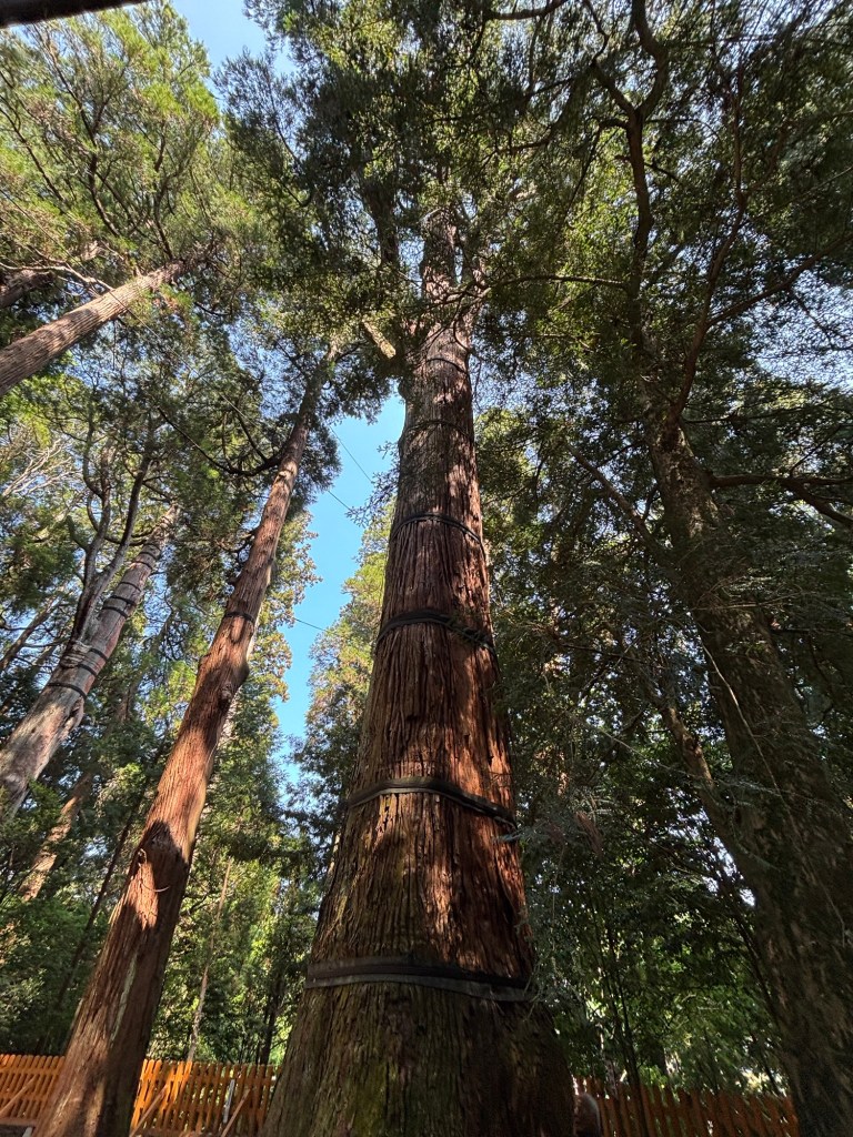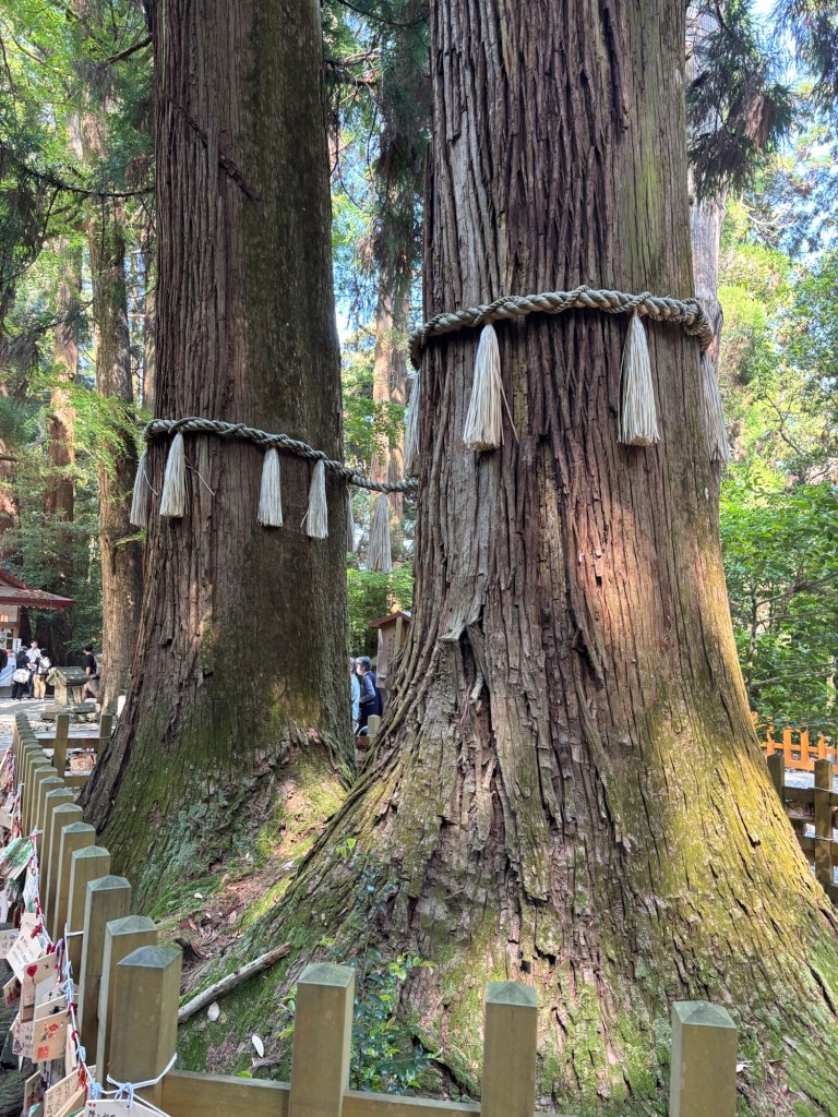 Au sein du sanctuaire, les visiteurs peuvent admirer deux grands cèdres reliés par leurs racines mais aussi par des cordes de riz tressées, symbole puissant de l’union. Selon la légende locale, faire le tour de ces arbres main dans la main avec un être cher apporterait richesse et prospérité aux descendants du couple. Tout autour des plaques de dévotion sont attachées au muret pour que ses vœux se réalisent.