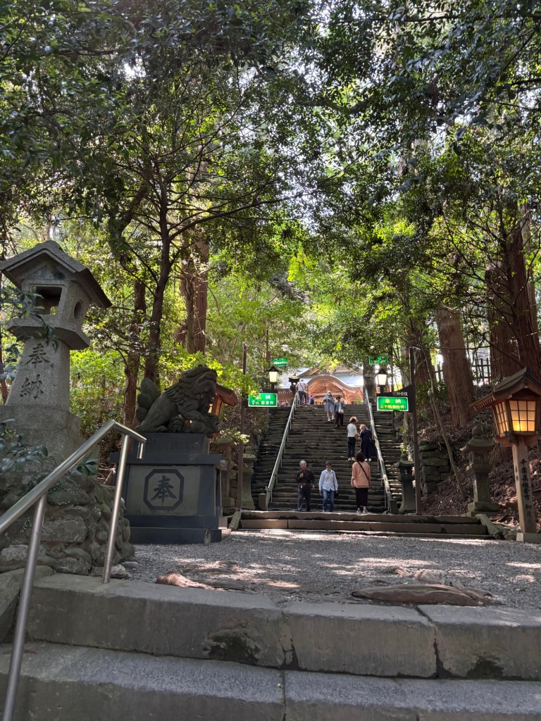 On gare sa voiture en bas sur le parking et on entre par le grand Tori tout gris noir pour se confronter aux escaliers qui mènent au temple.
