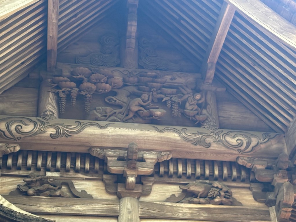 Il est aussi incroyable de voir les pans de murs qui sont reliés à la nature, aux animaux comme les singes, les cochons sauvages et de voir un homme avec une fusil pour tirer dessus. On aperçoit aussi un très bel oiseau aux plumes magnifiquement recrées en bois et au bec acéré. Et dans un coin un prêtre en robe de prière tient une épée enfouie dans sa jupe. Et un autre en dessous a les bras au-dessus de la tête comme si le prêtre allait le décapiter.