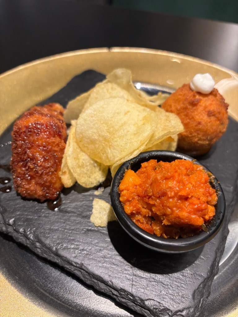 Les apéros du soir avec des amuse-gueules : chips, tomates écrasées chaudes et deux croustillants au fromage tout chaud qui fondent dans la bouche avec un Spritz à la bergamote. Cela fait partie des petits bonheurs à ne pas se refuser !