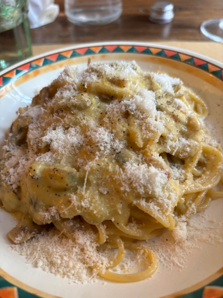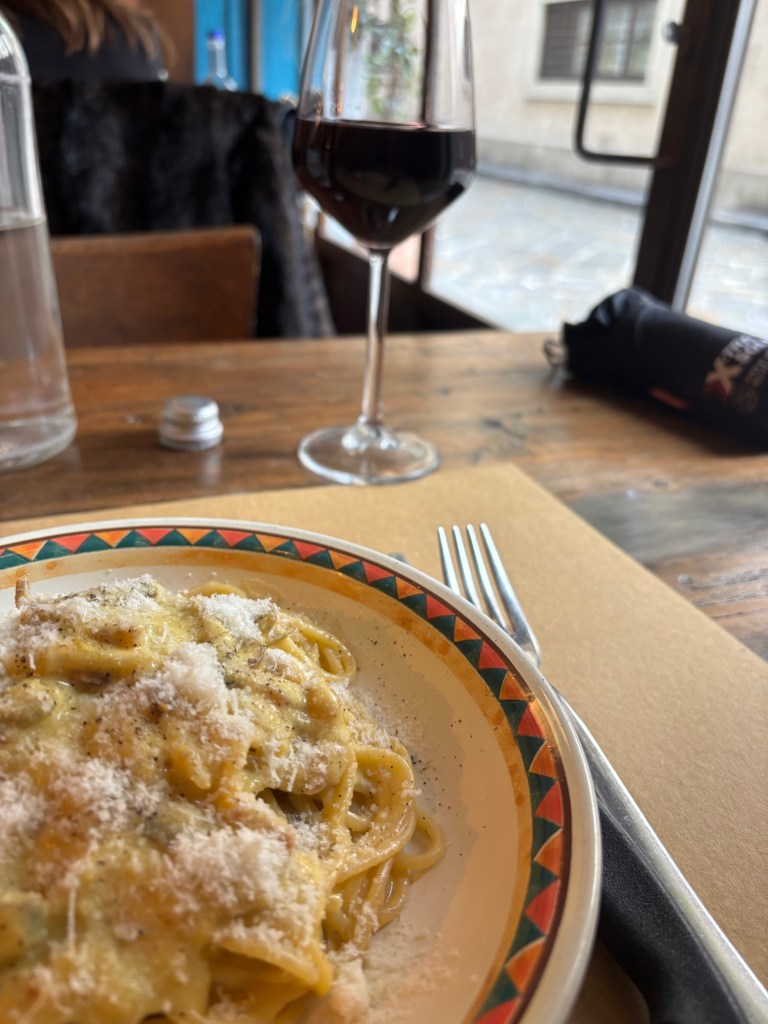 Et les pates pour reprendre des forces avec un verre de vin rouge derrière le musée Galileo et finir avec (encore) un capuccino.