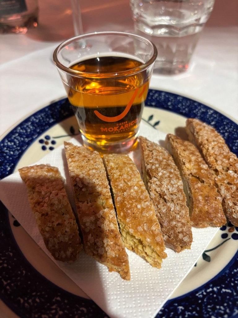 Et la spécialité des gâteaux durs aux amandes, les cantucci, que l’on trempe délicatement dans un alcool sirupeux. A tester obligatoirement !