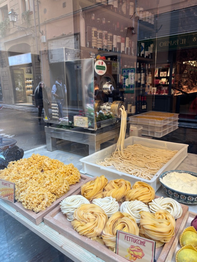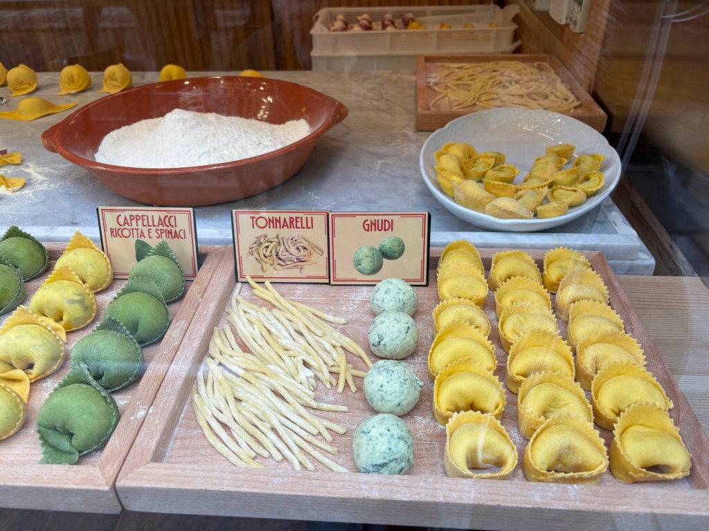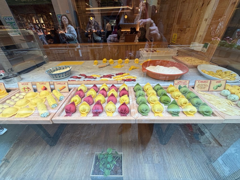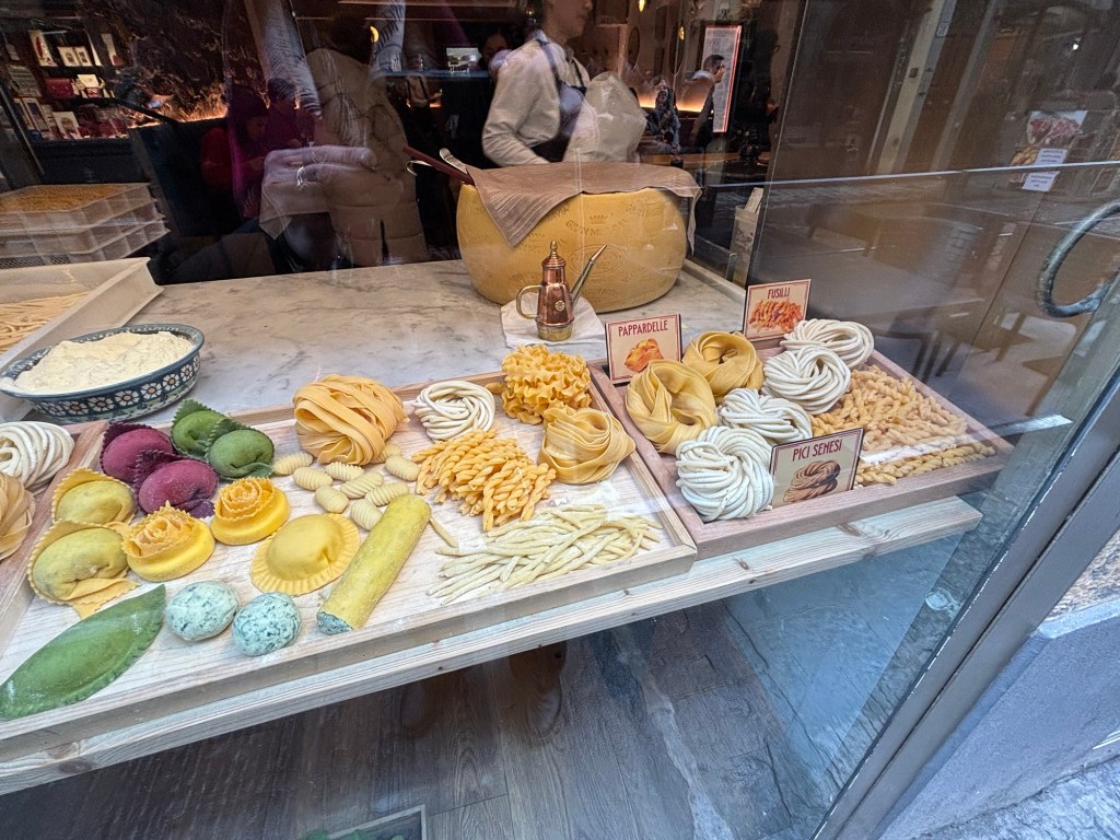 Et puis pour finir de vous allécher, je suis tombée sur une boutique/restaurant de pasta faites devant vous. Et là vous pouvez découvrir les noms des pâtes car elles sont différentes les unes des autres : Parpadelle, fusilli, pici senesi sorte de chignon de cheveux torsadés, des raviolis verts, des parpadelle ripiena sorte de rose en pâte, des gnocchi, des tortelli, des cannellonis tout en longueur fourrés, des gnudi verts sorte de gros caillous, des tonnarelli cheveux fins, des cappellacci à la ricota et aux épinards mais aussi grenats et jaune – sorte de capes, des reginette toutes torsadées et des fettuccine torsadées. On peut même voir la machine dont les pâtes sont sorties toutes fraiches. Je suis impressionnée par les noms et le nombre de produits. Et encore je pense que nous n’en voyons qu’un petit exemple !