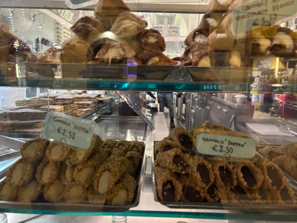 Après il y a les gâteaux à tomber raide mort devant les vitrines les plus affriolantes les unes que les autres. Avec ces espèces de cornets avec du chocolat ou de la pistache dedans. Ils s’appellent des cannolos – c’est à se damner !