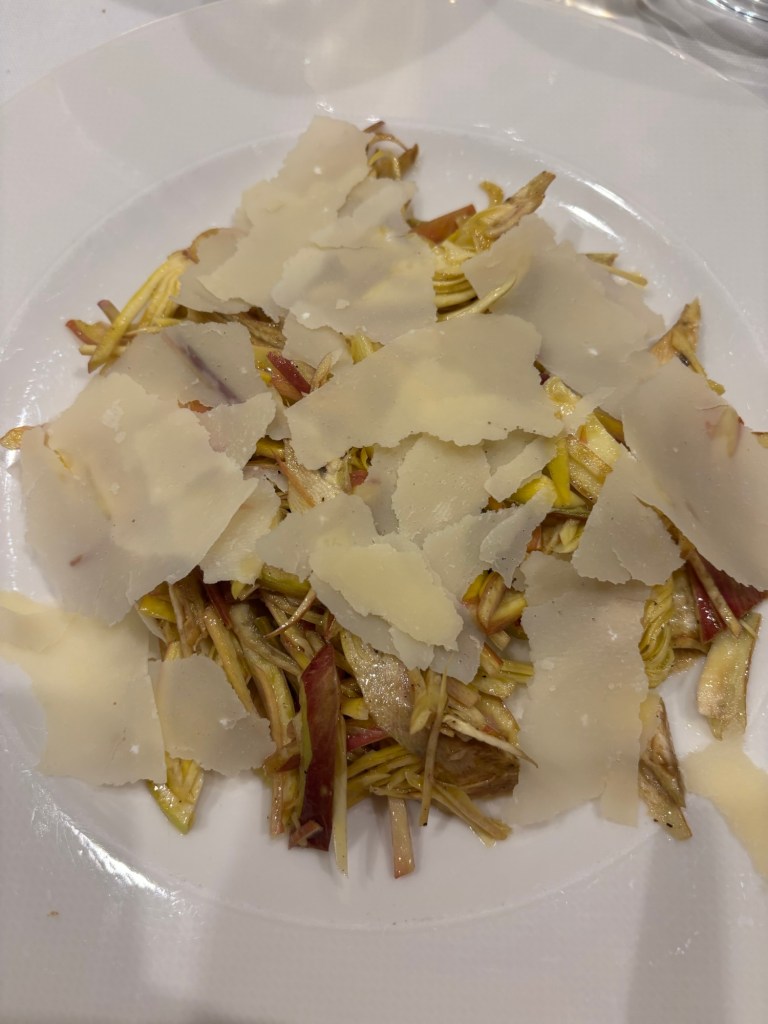 Et puis les repas qui vous réchauffent le cœur le soir après une journée de marche : les artichauds coupés en fins filets recouverts de tranches de parmesan le tout arrosé légèrement d’huile d’olive – un délice amer !