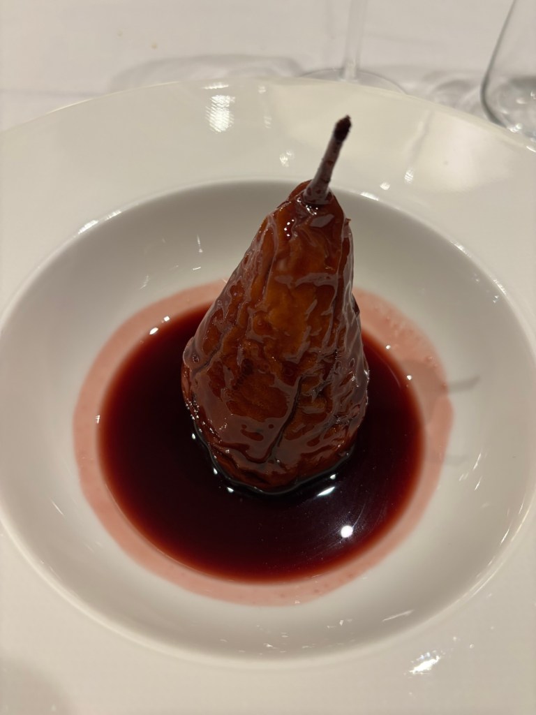 Et le dessert une poire au vin dans son sirop sucré. Le tout arrosé de vin blanc.