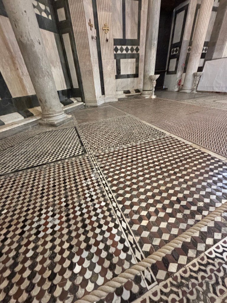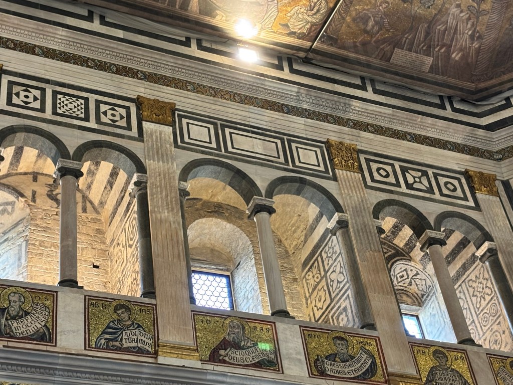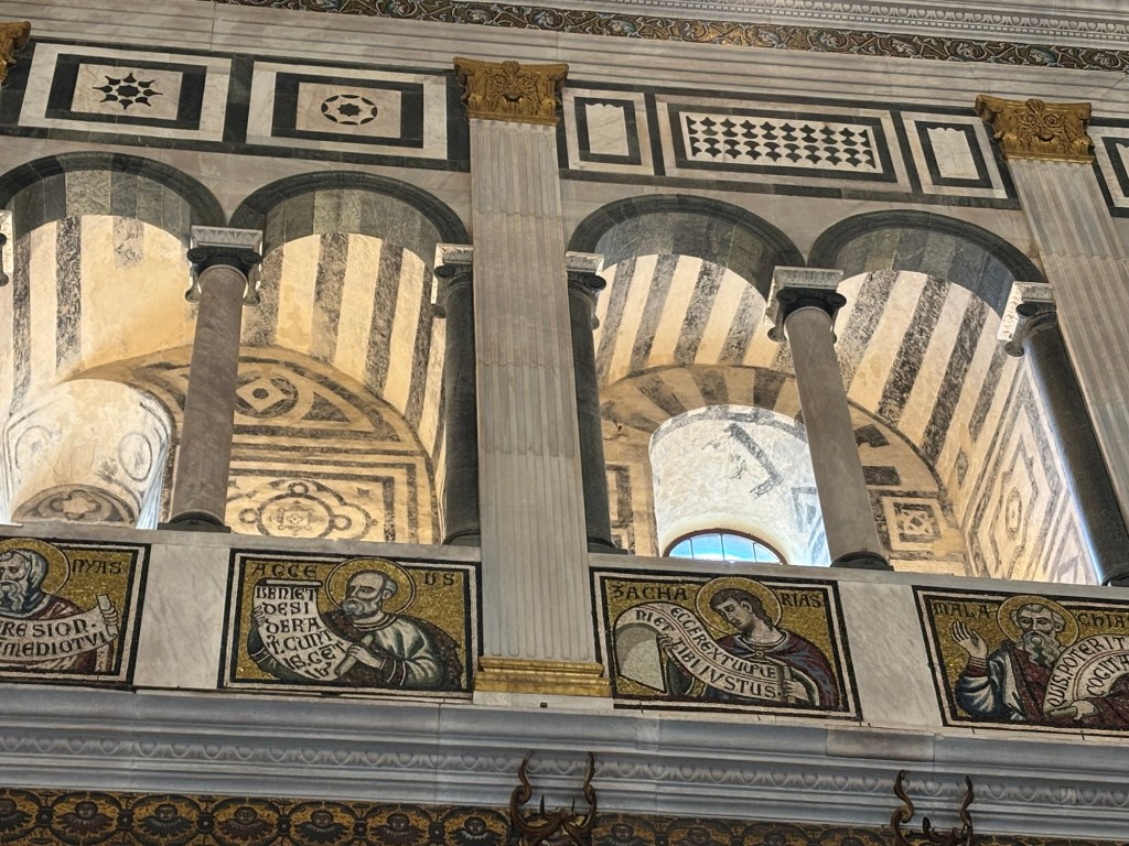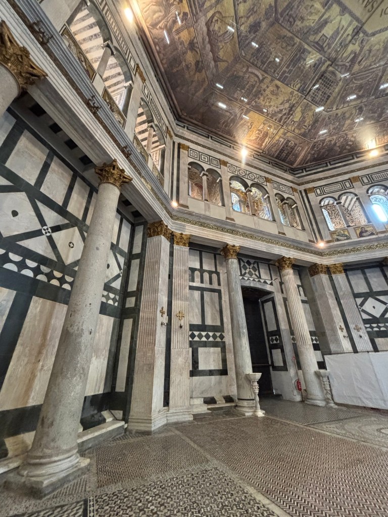 L’intérieur du baptistère, 25 mètres de diamètre, que nous ne pourrons pas voir, est largement inspiré du Panthéon de Rome. Les murs sont recouverts de marbre encadrés de colonnes et pilastres en granit.