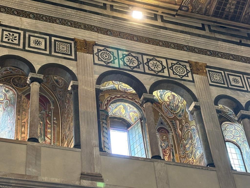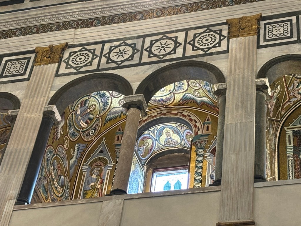 Et puis regarder en hauteur les parois qui sont recouvertes de magnifiques mosaïques. Les galeries sont de fausses fenêtres correspondant à celles de l’extérieur et permettant à la lumière d’entrer. Tout y brille et attirent les yeux ! Tout le long on peut y découvrir des Saints. Et à l’intérieur des anges, des oiseaux, la Vierge, le Christ et tant d’autres figures religieuses.