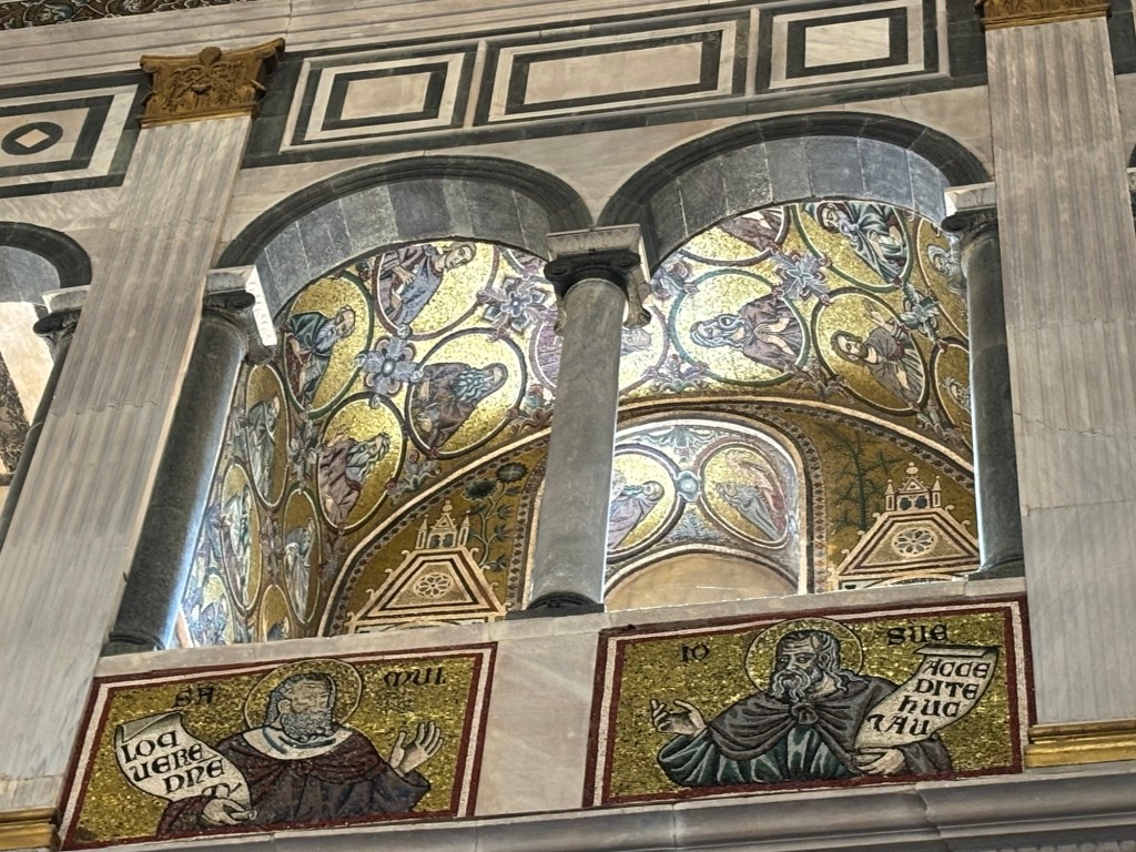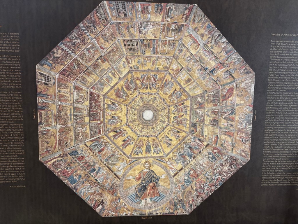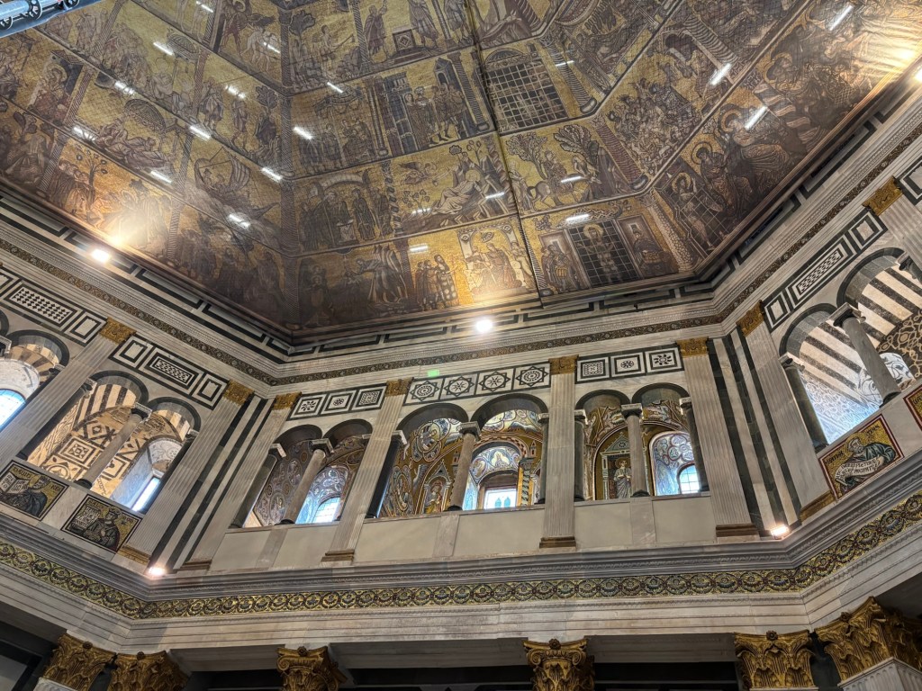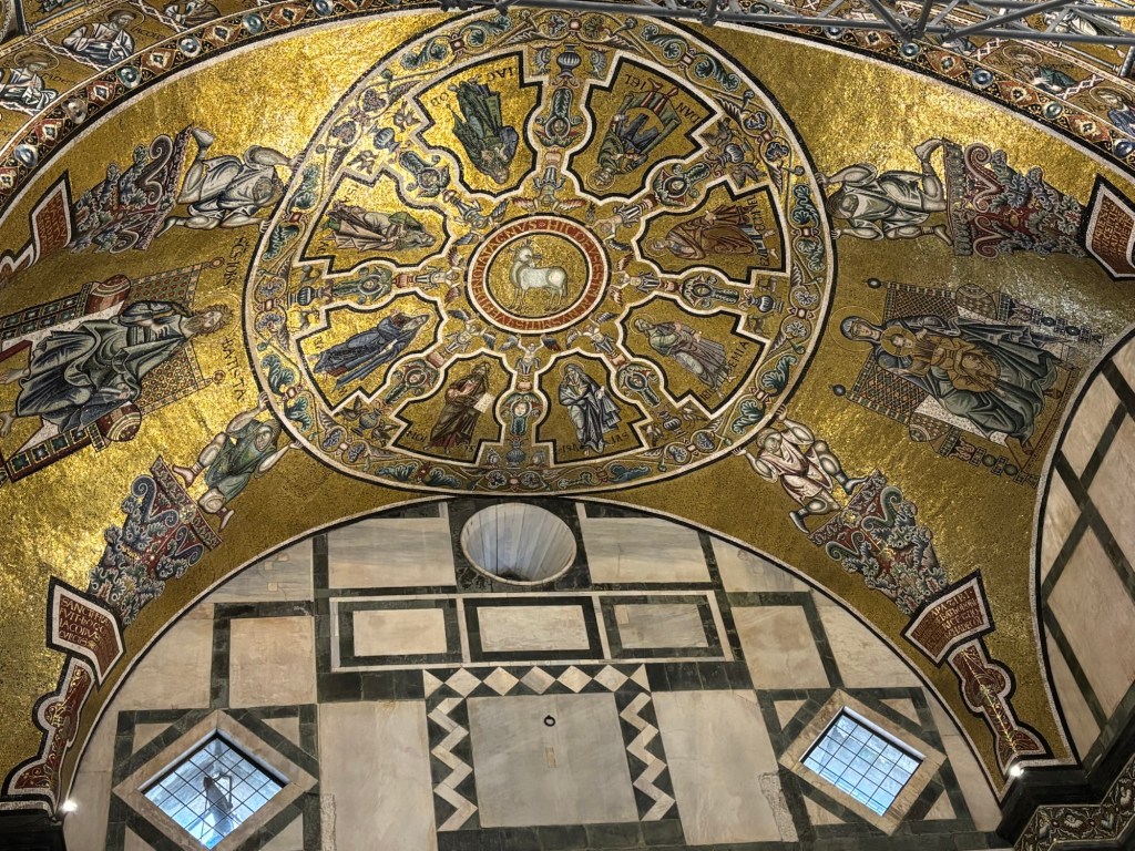 L’intérieur de la coupole est recouvert de superbes mosaïques de style byzantin, réalisées en grande partie par des mosaïstes Vénitiens, mais également par des Florentins, dont Cimabue. Il y a 1000 m2 de mosaïques !