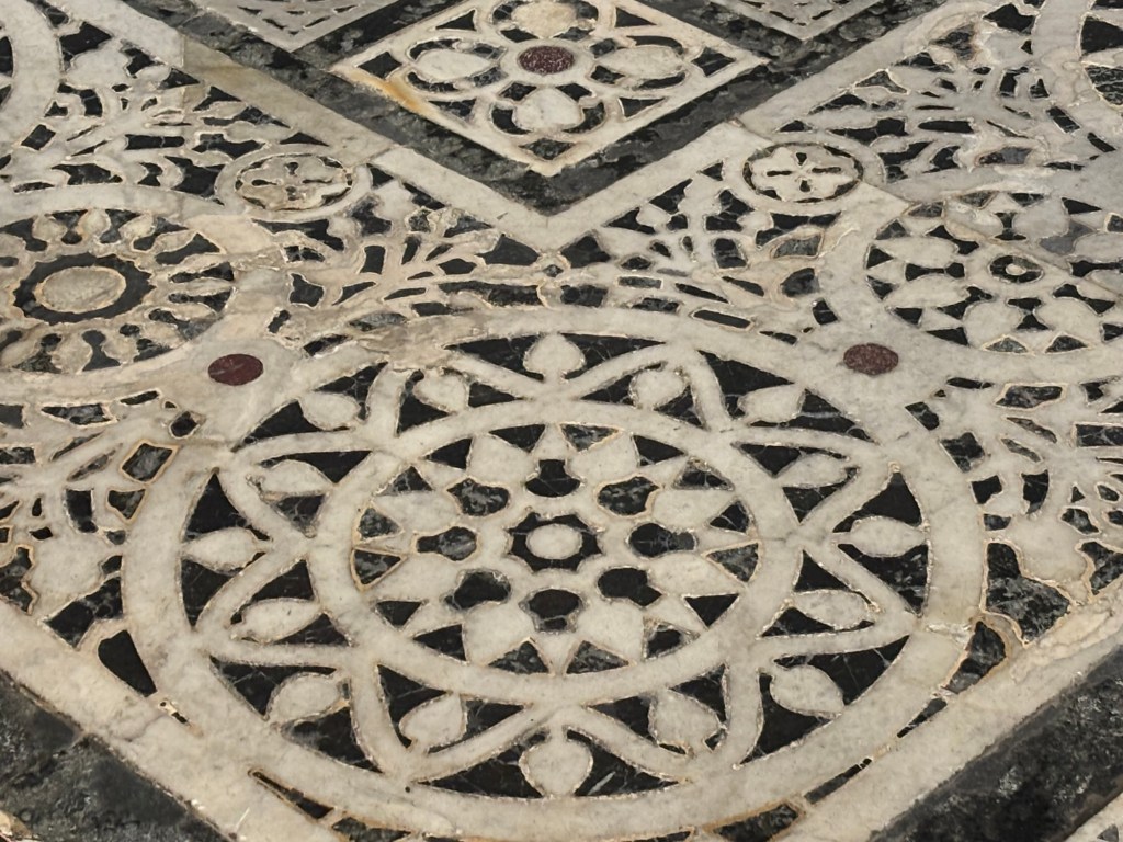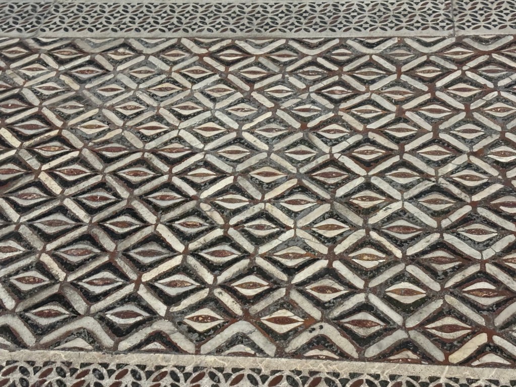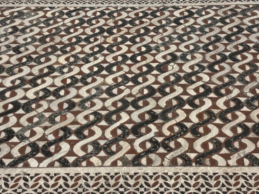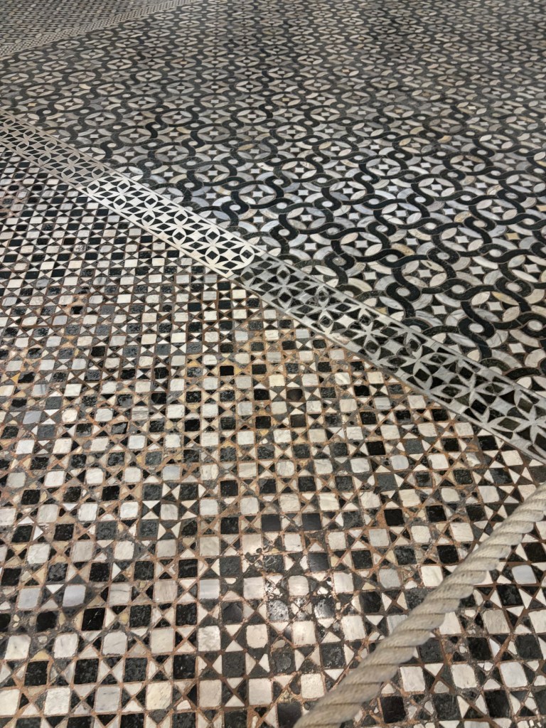 Admirer les sols carrelés, en damier, en zigzag, en clochette ou tout autre forme fut un régal des yeux. Certains représentaient des fleurs. Le tout en noir et blanc. Certains font des cercles avec au milieu du rouge donnant comme une envie de rythme fou. On aurait eu envie de valser rien que pour glisser sur un marbre lisse. Si cela ne faisait pas incroyant j’y aurais bien vu des derviches tourneurs s’y exercer.