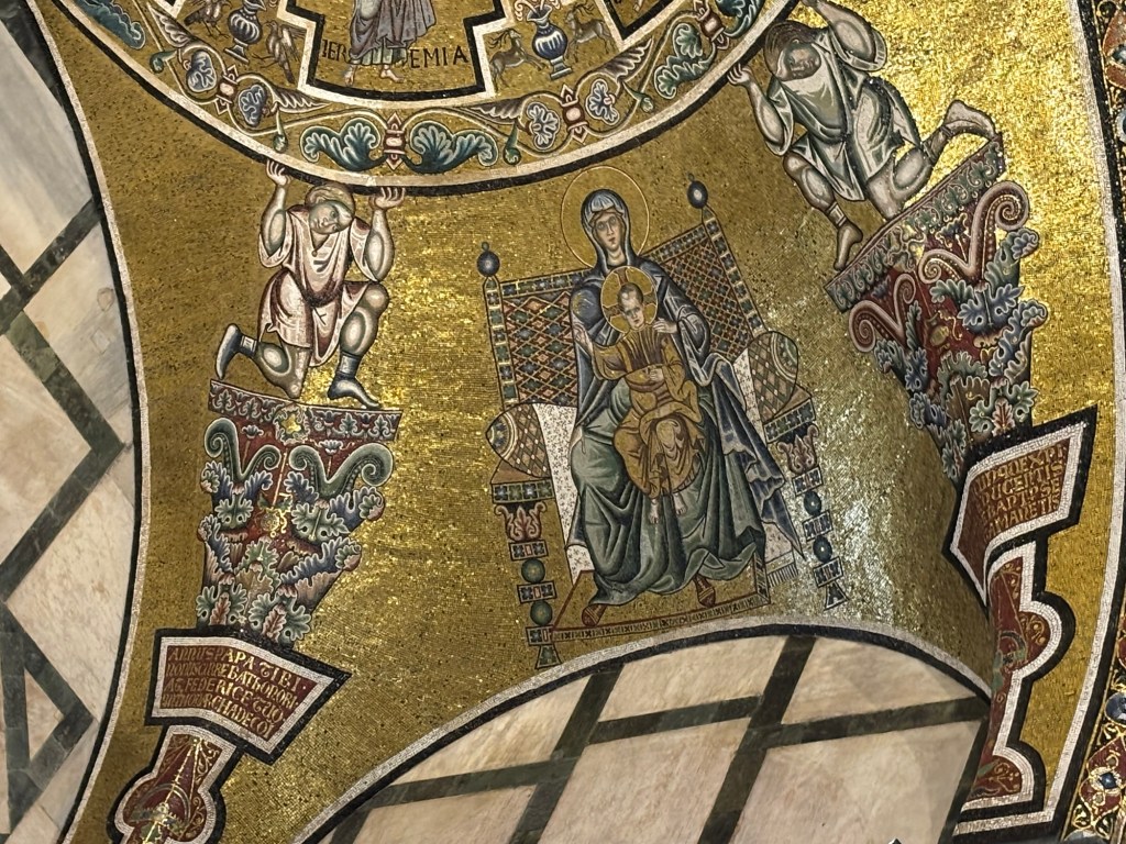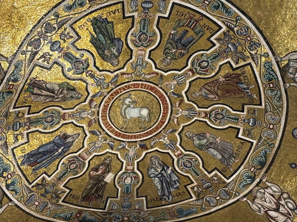 La mosaïque la plus impressionnante est celle du Christ juge qui domine la voûte. Il t’observe, immense et majestueux, les bras ouverts, entouré des élus et des damnés. Autour, huit registres illustrent des scènes de la Genèse, des récits de Saint Jean-Baptiste, du Christ et de la Vierge. C’est un véritable livre d’images en or et en couleurs, où chaque détail est pensé pour capter ton regard. Je n’en verrais qu’une reproduction !