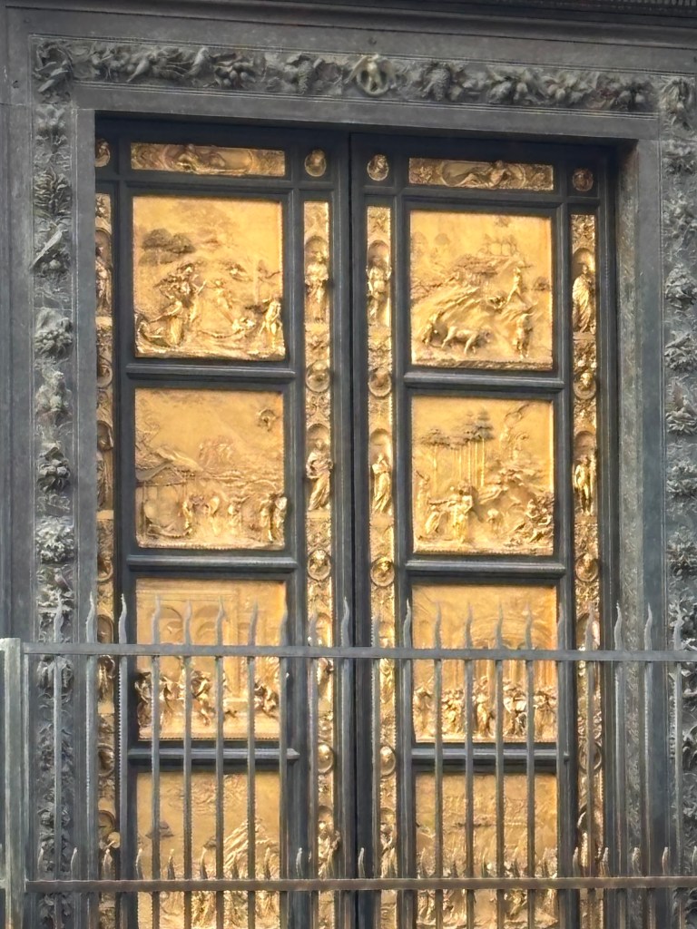 Et puis il y a l’extérieur avec ces trois portails en bronze sculptés : la porte sud est l’œuvre d’Andrea Pisano, tandis que les portes nord et est (celle-ci surnommée « Porte du Paradis ») sont dues à Lorenzo Ghibert. On peut y voir : Adam et Eve ; Caïn et Abel ; Noé ; Abraham ; Isaac avec Esaü et Jacob ; Joseph ; Moïse ; Josué ; David ; Salomon et la reine de Saba.