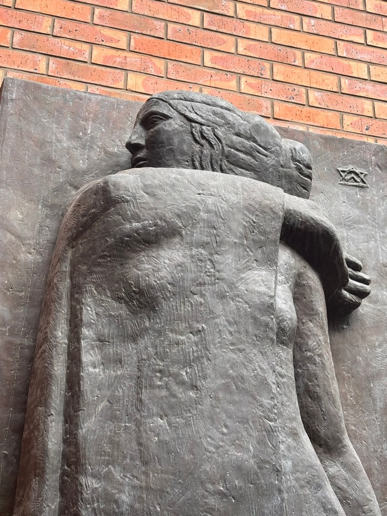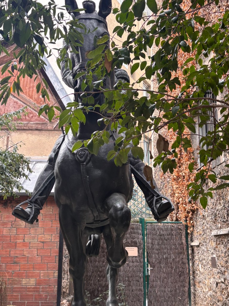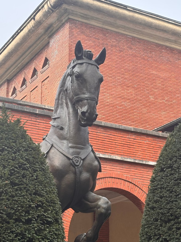 Mais profitons de la cour intérieure avec le grand cheval qui est au milieu. Je suis toujours étonnée par la dimension de l’animal qui ressort sur les briques du mur du musée.