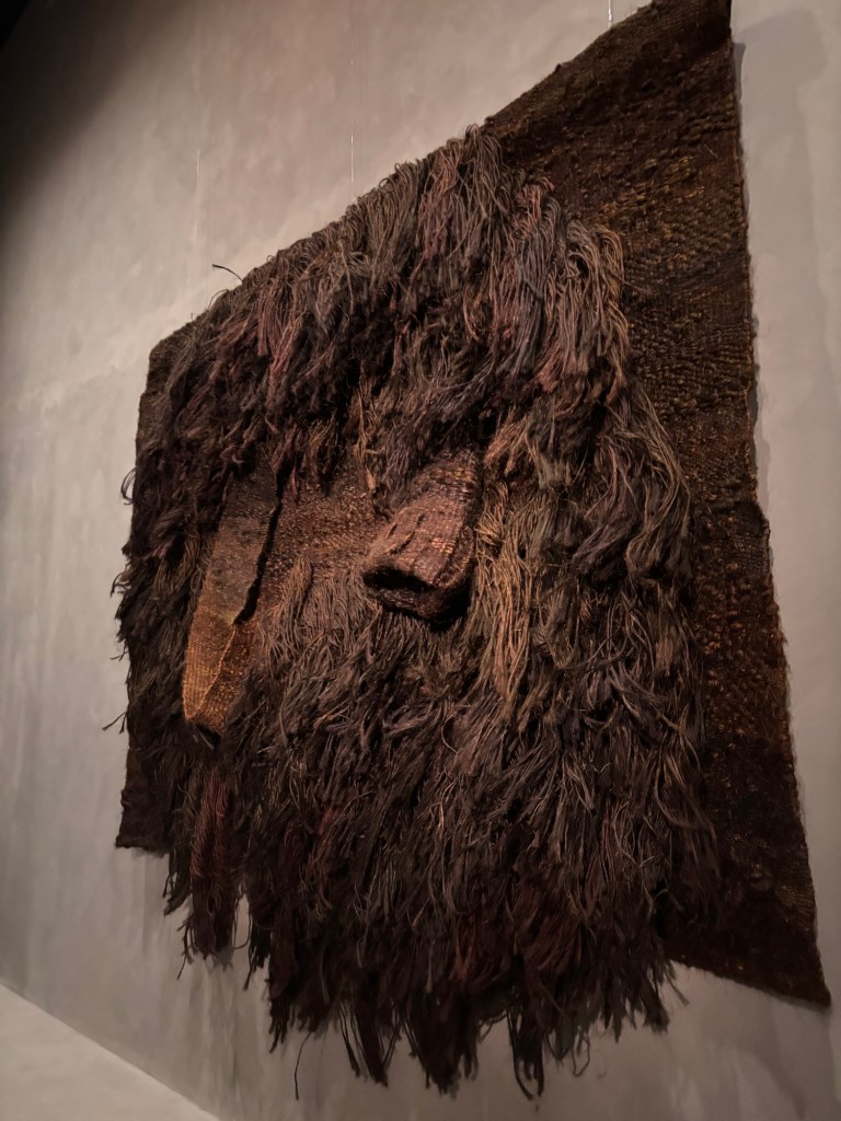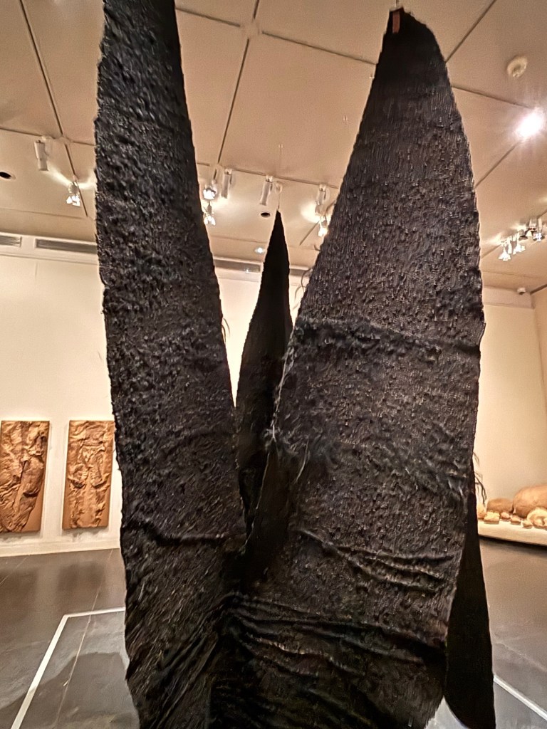 Beaucoup de textiles suspendus dits les Abakans, de spectaculaires pièces textiles suspendues au plafond. Ces textiles dissimulent les « secrets » de leur nature. Riche de fentes, de replis, leur enveloppe tactile suscite toutes sortes d’analogies organiques : la chair écorcée du bois, la fourrure d’un animal, les lèvres ourlées d’un sexe féminin… J’avais envie de passer entre les tissus ou bien de m’enfouir dedans pour disparaitre à jamais. On pourrait presque comparer ces textiles à de la fourrure tellement dense qui fait apparaitre des paysages ou bien des animaux comme les bisons. Ou bien des bêtes à cornes !