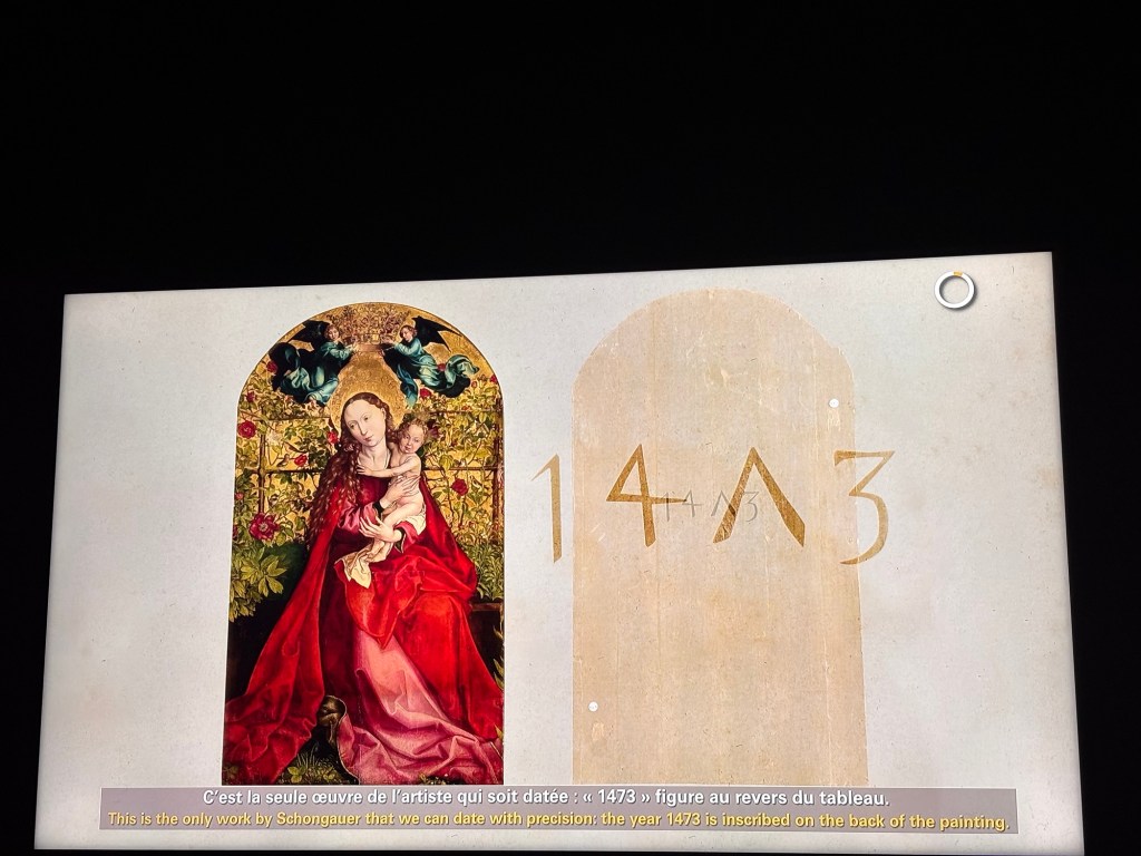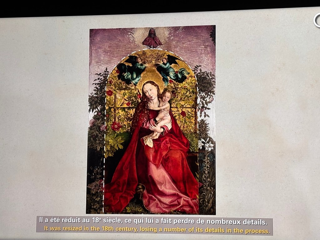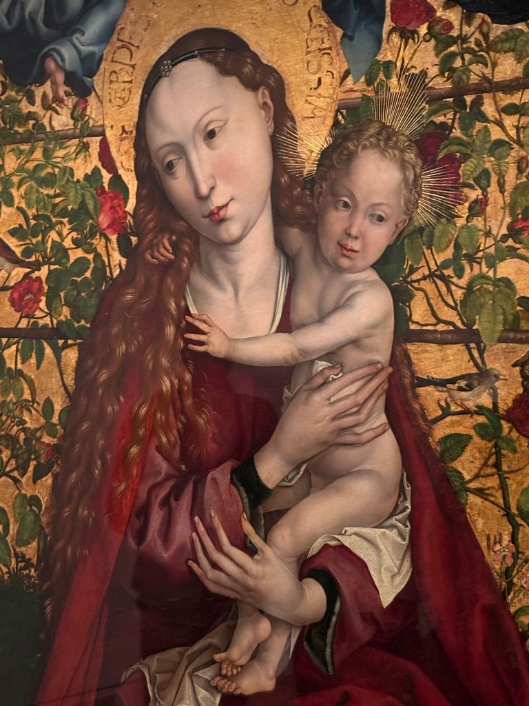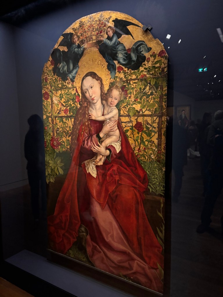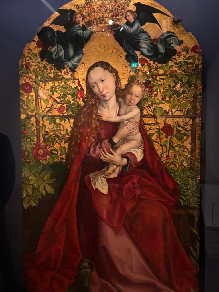 Quelques beaux tableaux peints et très colorés et de très belles gravures de Saints ou de la Vierge. Et surtout la Vierge au buisson de roses de 1473 qui m’a subjugué. Ce qui frappe c’est la fluidité et la subtilité de ses tableaux. On y trouve au travers des personnages de la sérénité et la tendre intimité entre la mère et l’enfant.