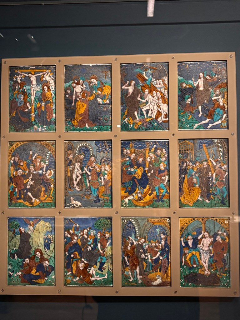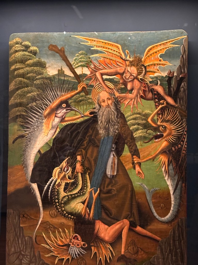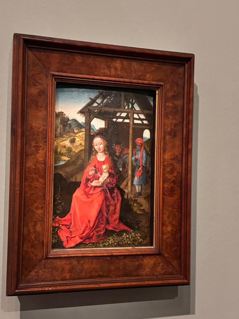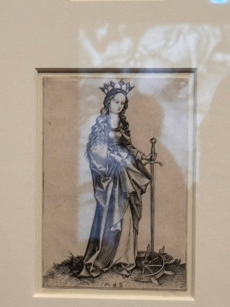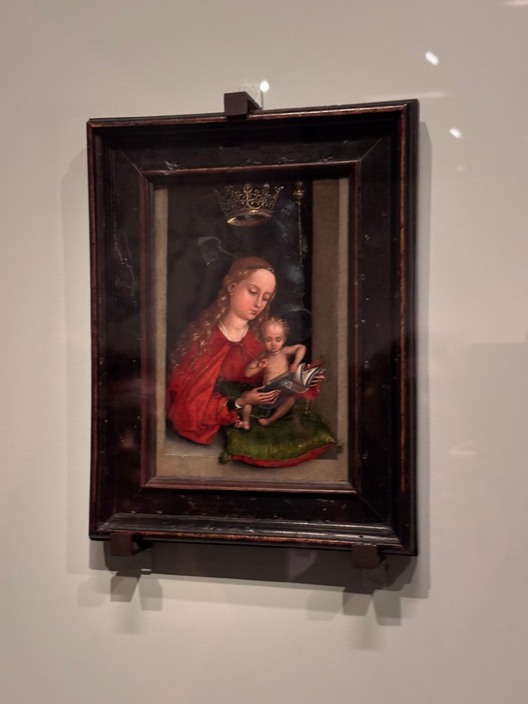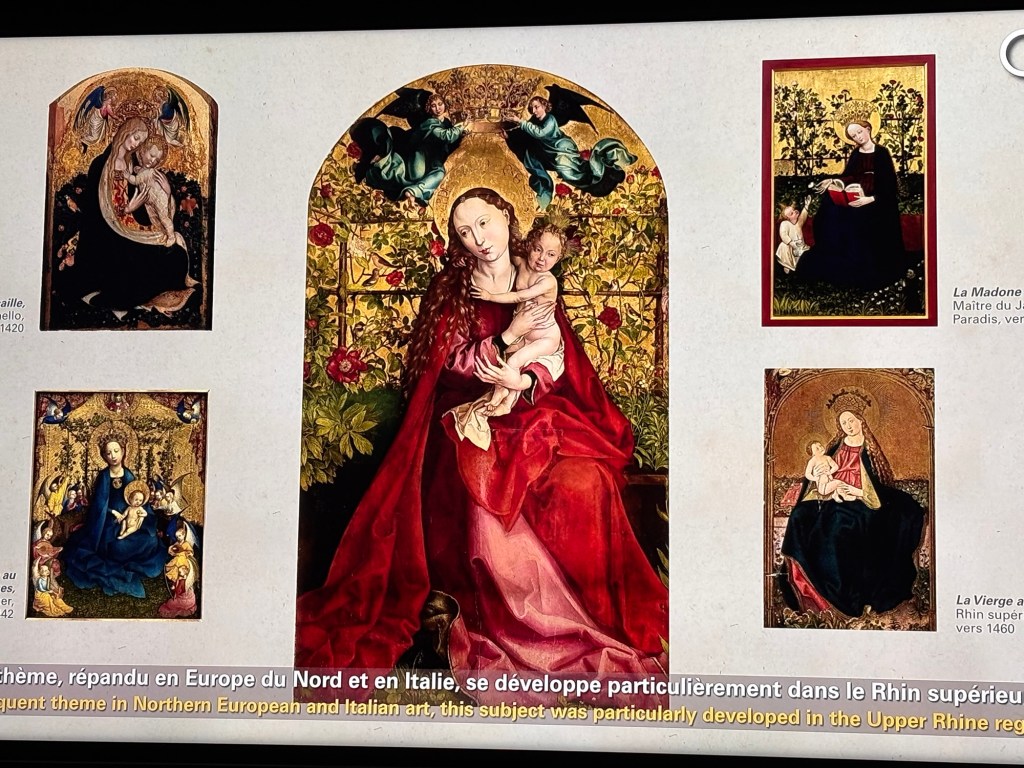 Quelques beaux tableaux peints et très colorés et de très belles gravures de Saints ou de la Vierge. Et surtout la Vierge au buisson de roses de 1473 qui m’a subjugué. Ce qui frappe c’est la fluidité et la subtilité de ses tableaux. On y trouve au travers des personnages de la sérénité et la tendre intimité entre la mère et l’enfant.