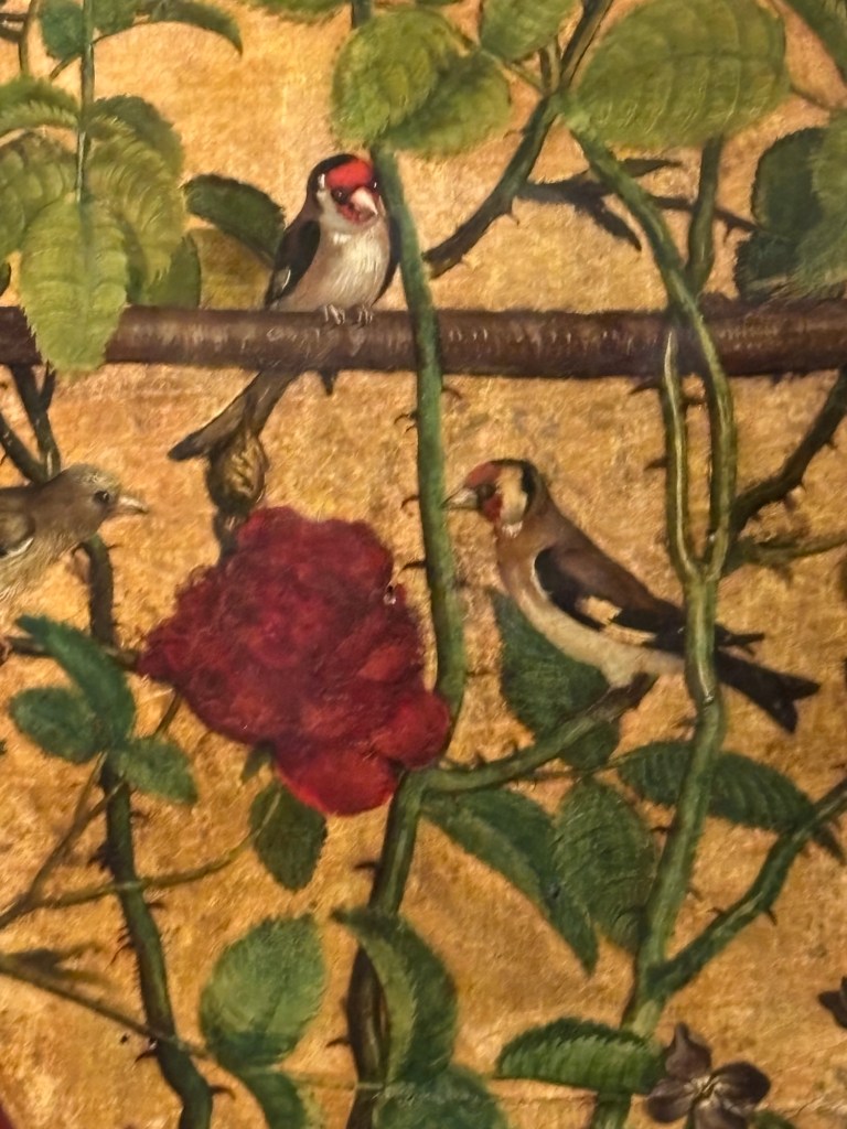 Je vais aller directement à La Vierge au buisson de roses où cette Vierge tourne les yeux de son enfant et est entourée d’oiseaux et de roses. Le tableau a été coupé et c’est le seul qui est signé sur l’encadrement et daté de 1473. Le thème est très répandu en Europe du Nord et en Italie C’est un tableau qui subjugue par les couleurs, les anges bleus au-dessus de la tête de la Vierge. Le détail des oiseaux sur les branches des rosiers est si fin, l’un s’appuyant sur la branche, l’autre picorant. Les différentes couleurs des roses qui vont du rose pâle au rouge foncé presque sang s’accordant au drapé de la robe de la Vierge. Et l’enfant qui regarde à l’opposé de la mère tout en entourant sa mère de ses petis bras.