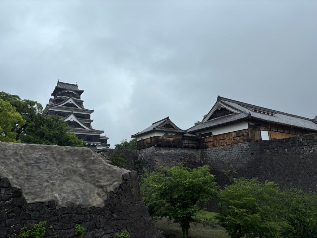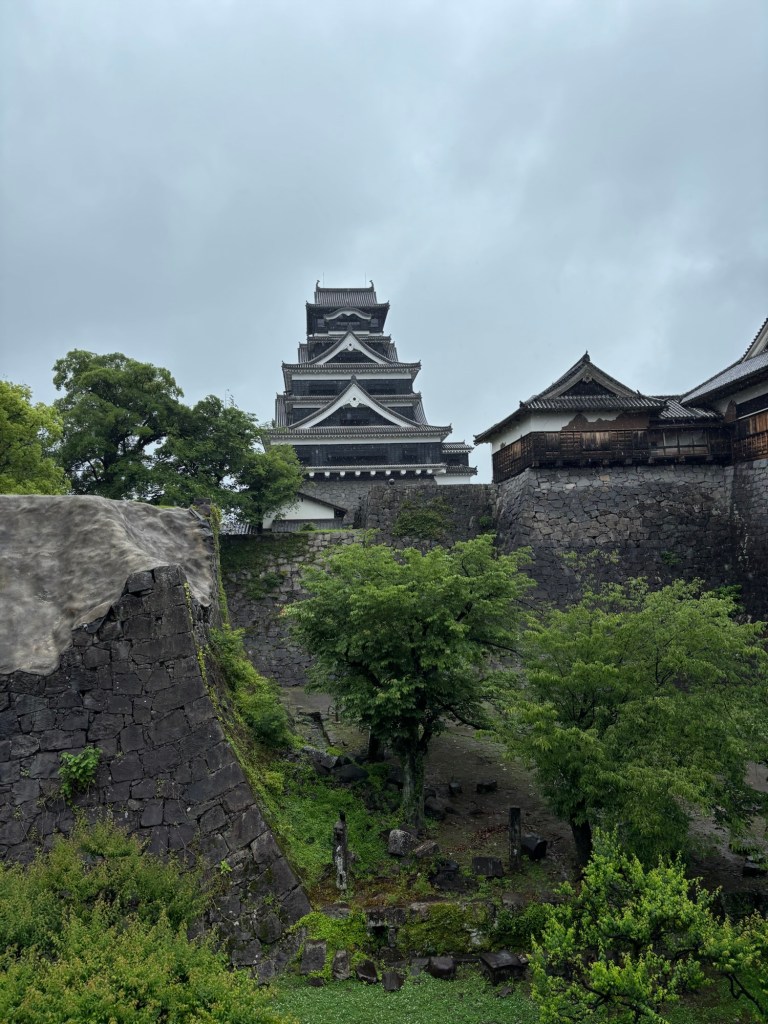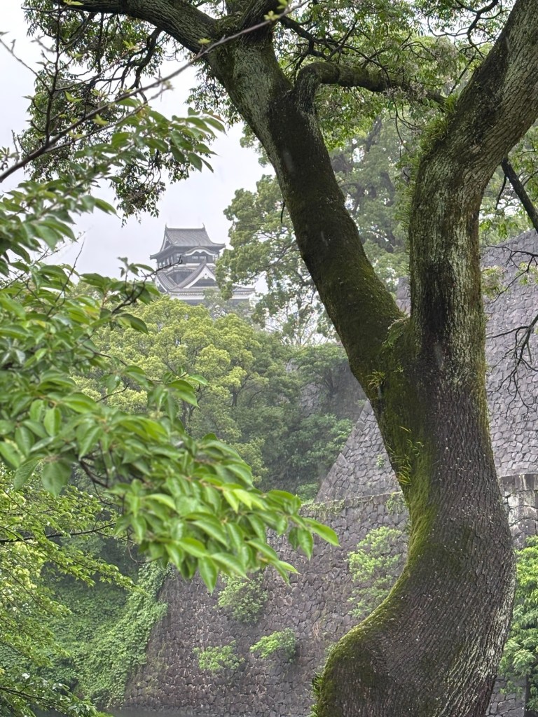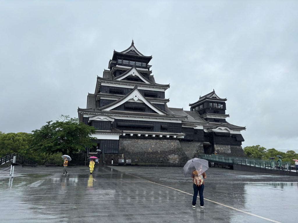 Une pluie battante m’accompagnait. J’ai laissé la valise dans une consigne et ai pris le tram pour rejoindre l’hôtel et surtout filer visiter le château de Kumamoto.