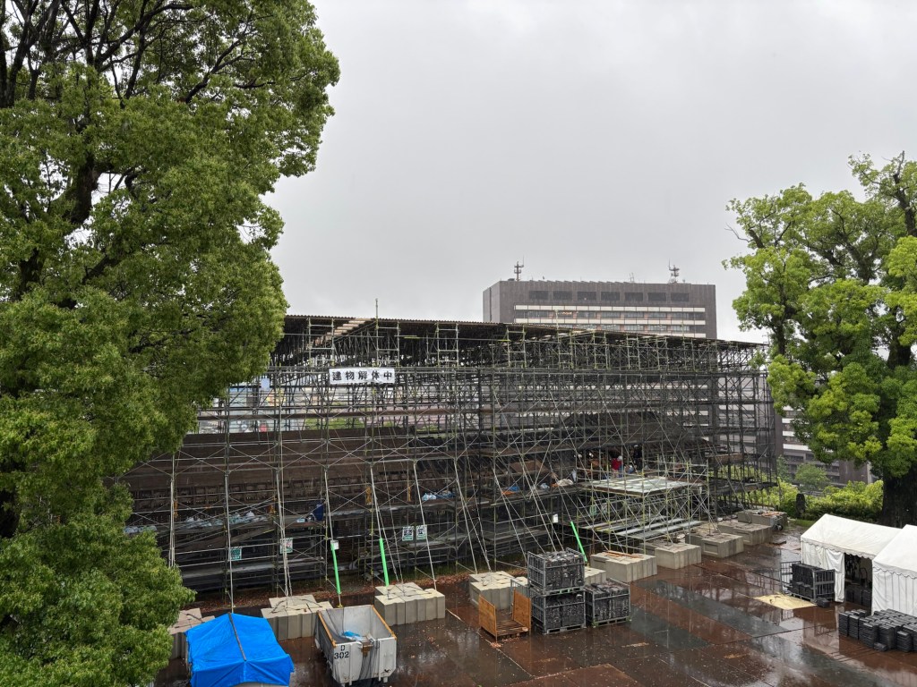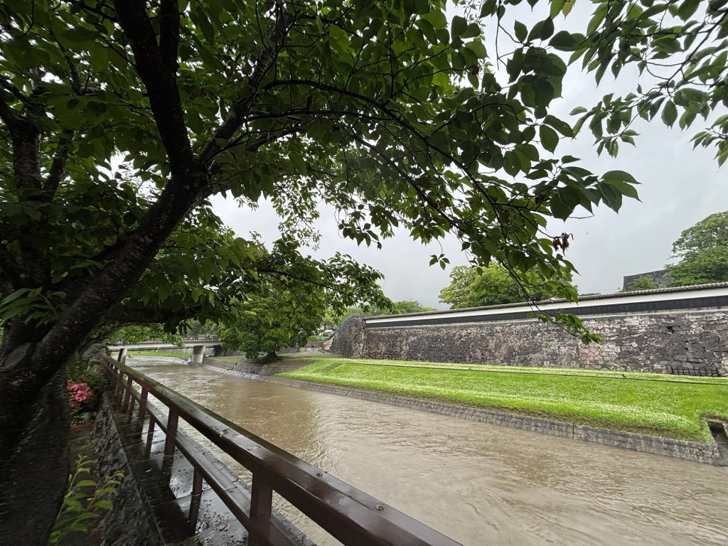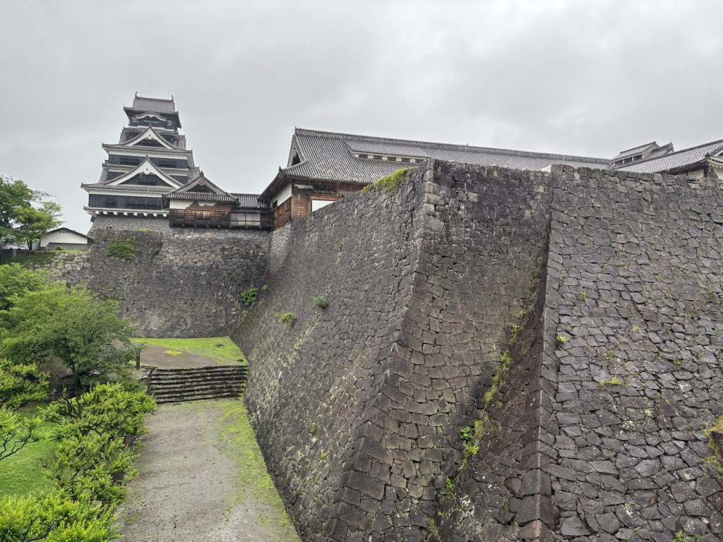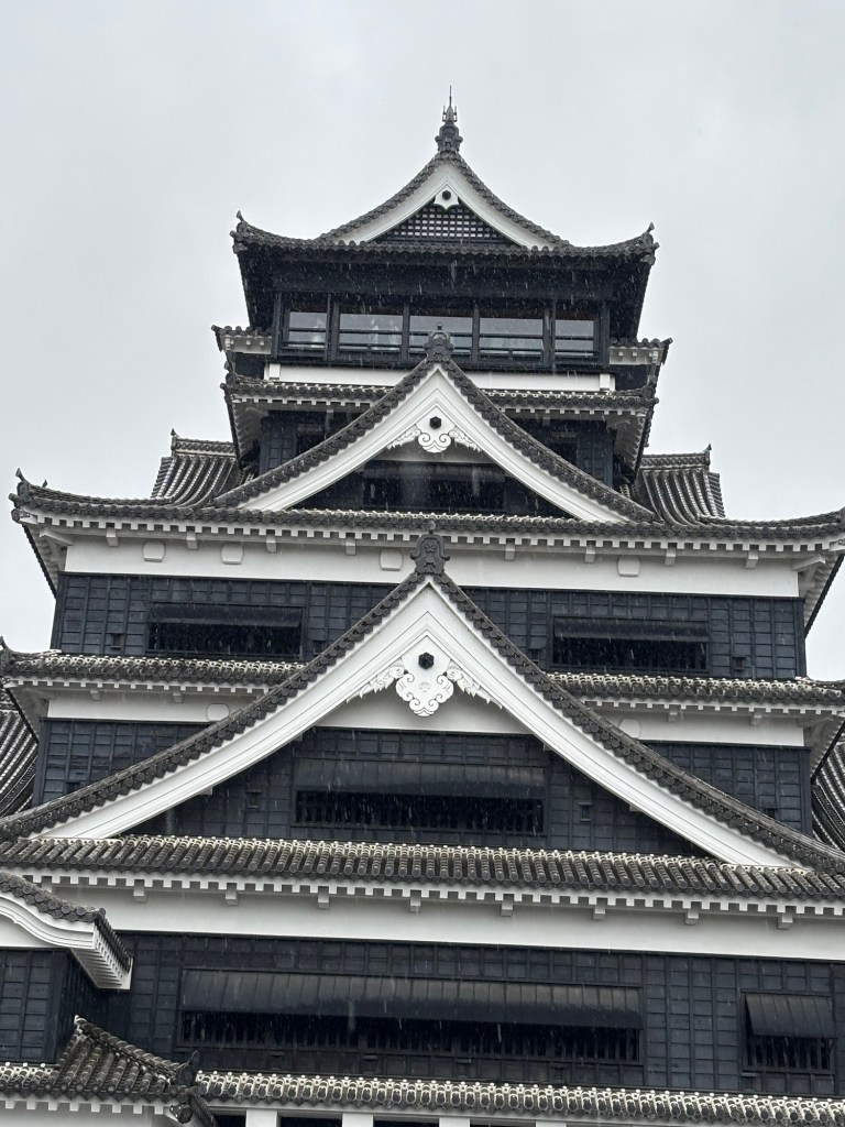 Une pluie battante m’accompagnait. J’ai laissé la valise dans une consigne et ai pris le tram pour rejoindre l’hôtel et surtout filer visiter le château de Kumamoto.