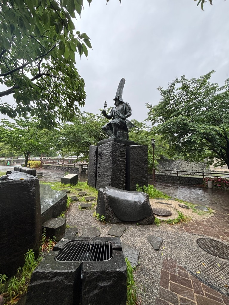 J’ai longé la rivière qui coulait à flots et charriait de la boue. Quelques belles statues parsemaient le chemin mais aucune envie de m’y arrêter. Et entre deux arbres qu’ai-je vu ? Le château de Kumamoto trônant !