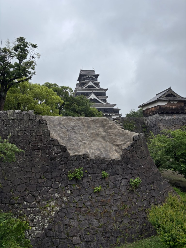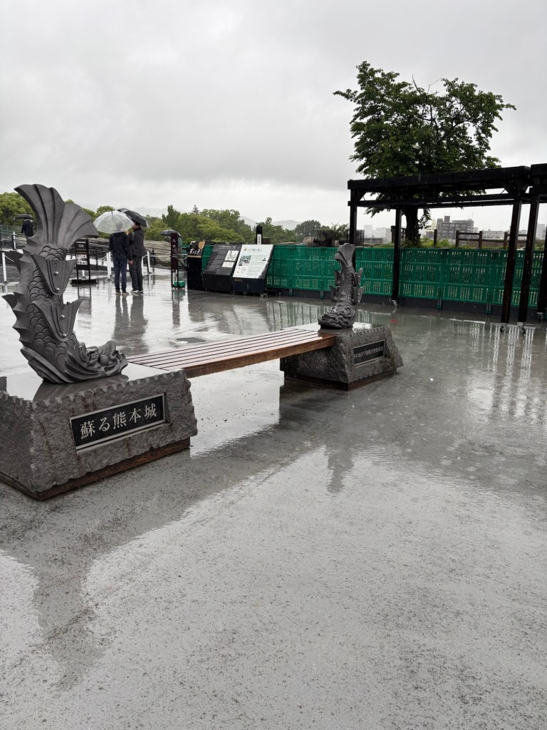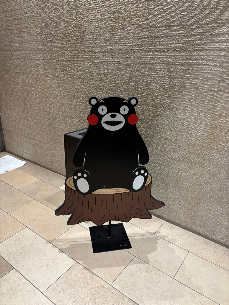 Je suis repartie de cette visite à nouveau sous la pluie et j’ai croisé l’emblème, mascotte de la ville de Kumamoto : l’ours noir dit Kamamon.