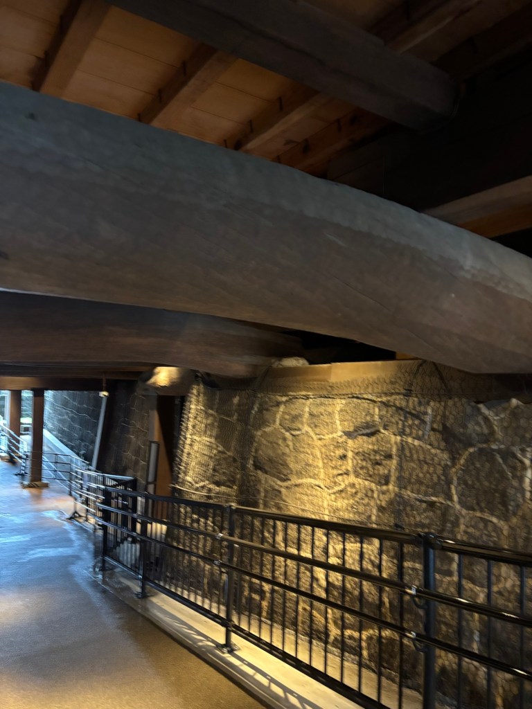 Enfin on entre dans le château par le sous-sol et on peut admirer les grosses poutres qui tiennent les fondations. Très impressionnant comme les pierres qui le constituent. Puis le château se révèle à nous dans toute sa grandeur. Le sol est toujours aussi glissant et j’ai failli me casser la figure.