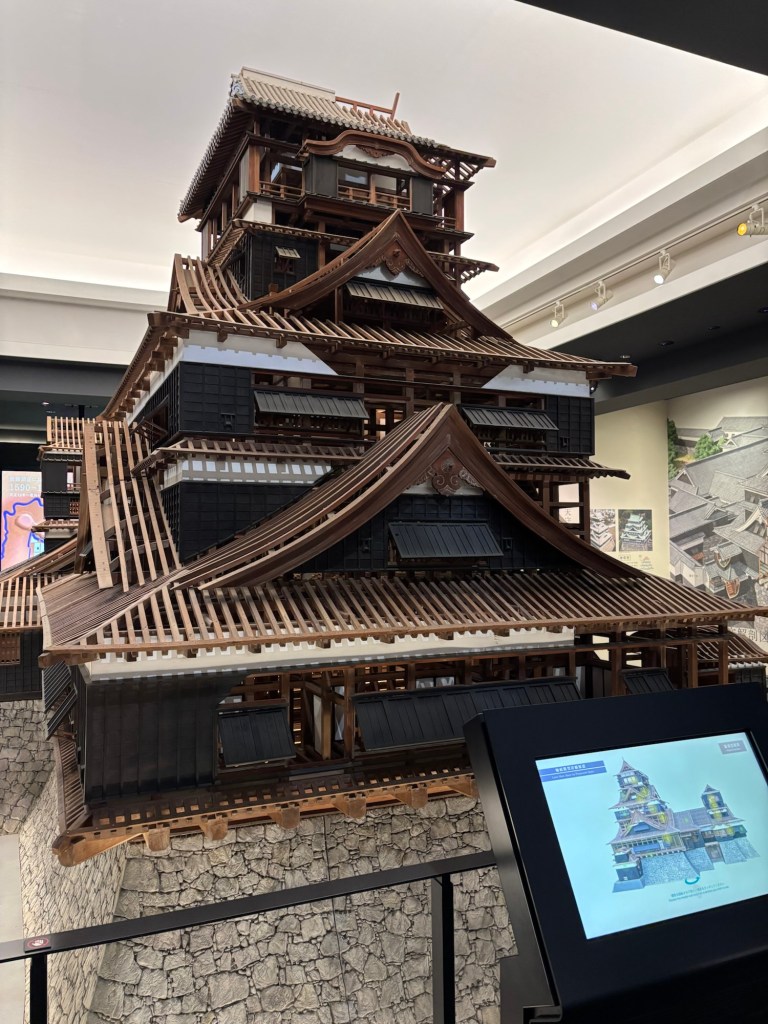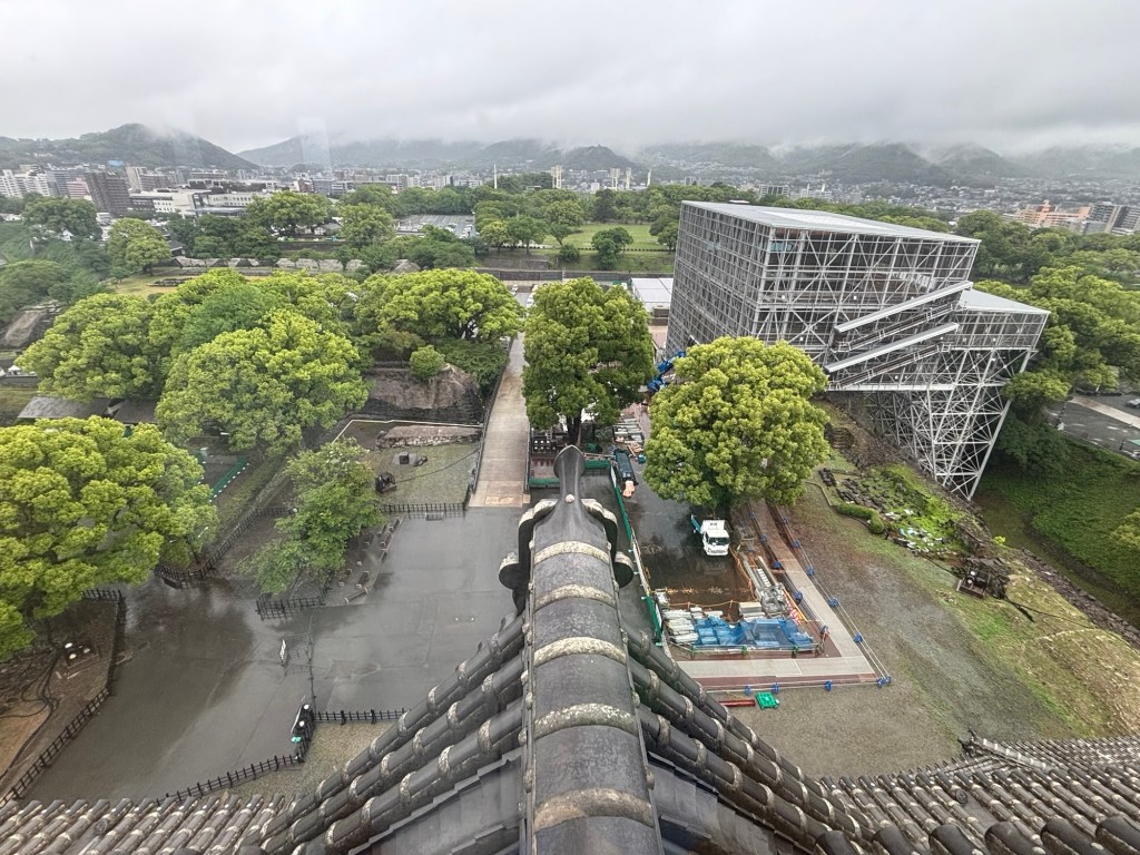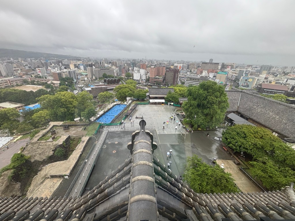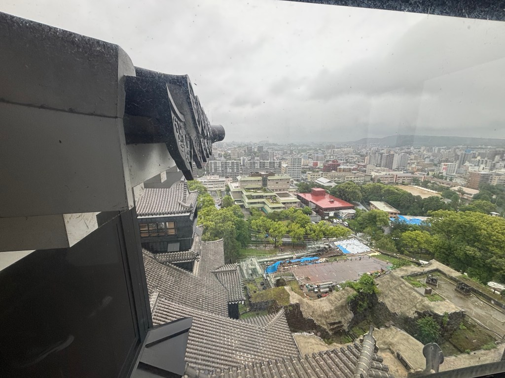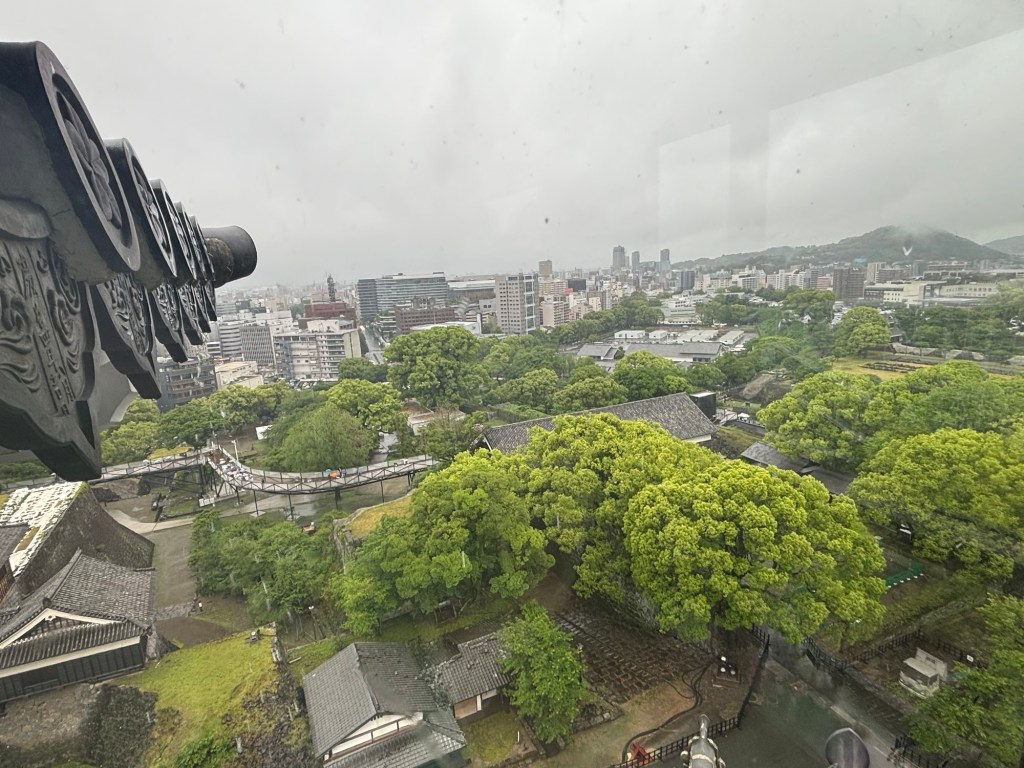 Tout en haut, au dernier étage on peut admirer la vue sur la ville de Kumamoto. Ville gigantesque si j’en juge les photos. Elle est verdoyante aussi mais le temps n’y est pas c’est le moins que l’on puisse dire.